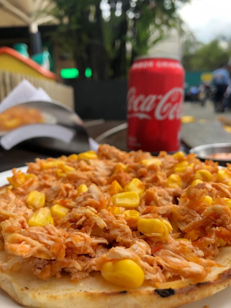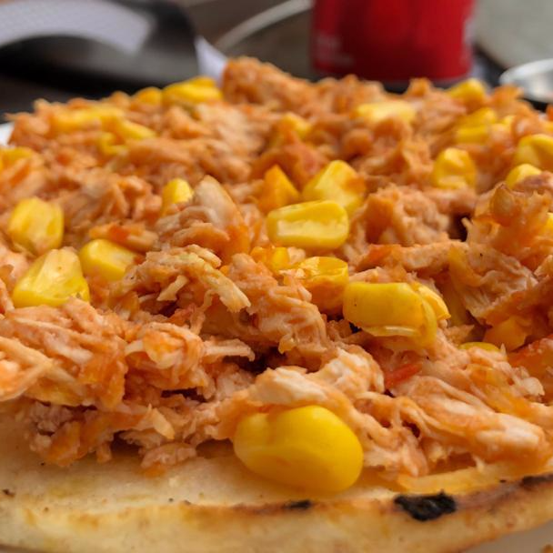 Arepa blanca con pollo, maicitos y hogao