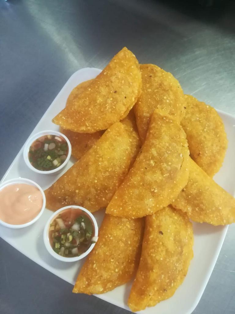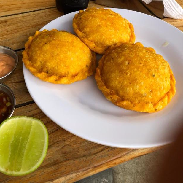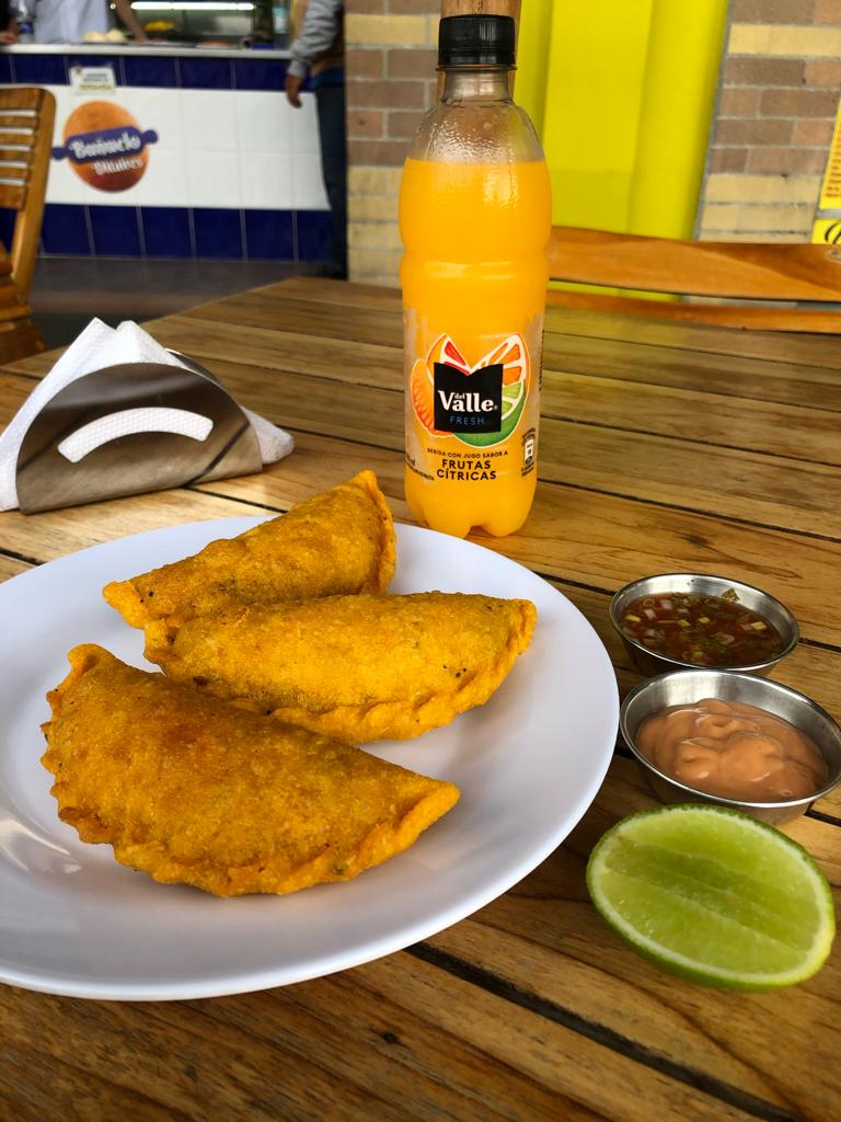 Una empanada de carne + una papa rellena + 2 buñuelos + 2 Maltas