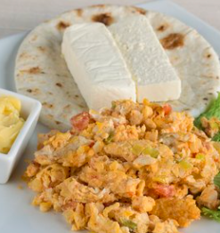 Huevos con aliños, arepa queso y mantequilla