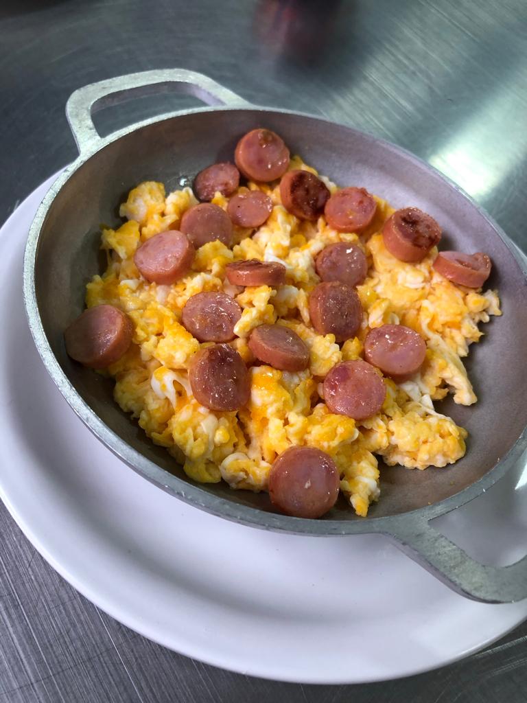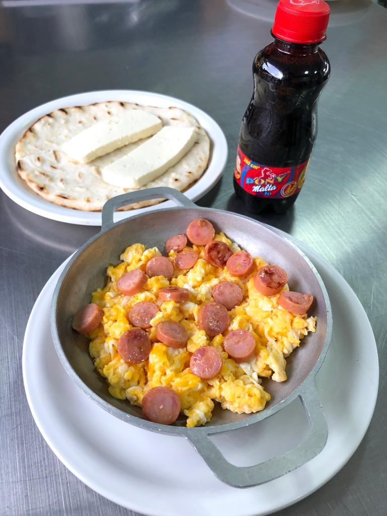 Huevo con salchicha ranchera, queso arepita y mantequilla