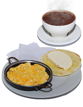 Huevos revueltos al gusto, arepa con mantequilla y quesito, chocolate en agua
