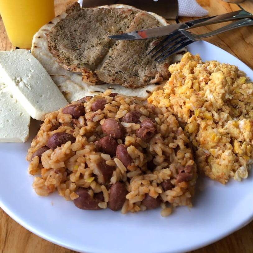 Arepa, tamal de pernil de cerdo y costilla de cerdo.