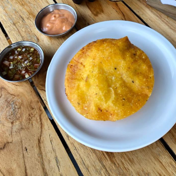 Arepa blanca con Carne, Pollo y Maicitos y hogao