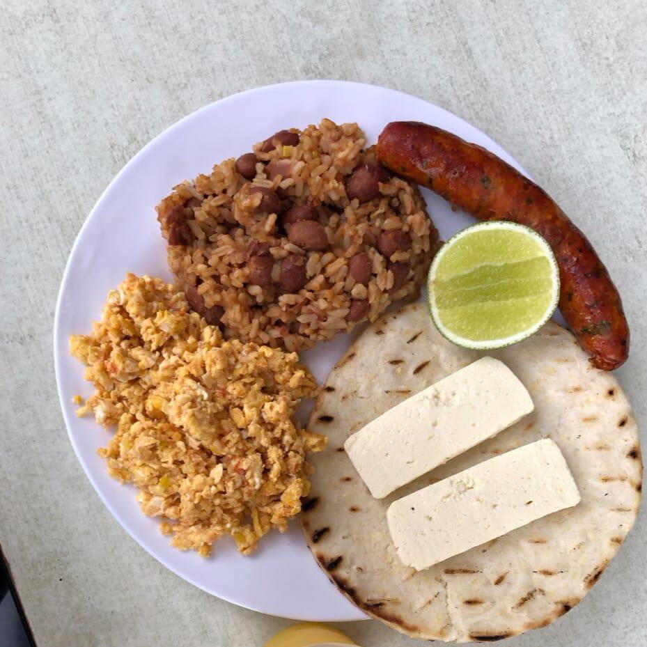 Porción de calentado, huevo con aliños, queso, arepita, mantequilla y chorizo.