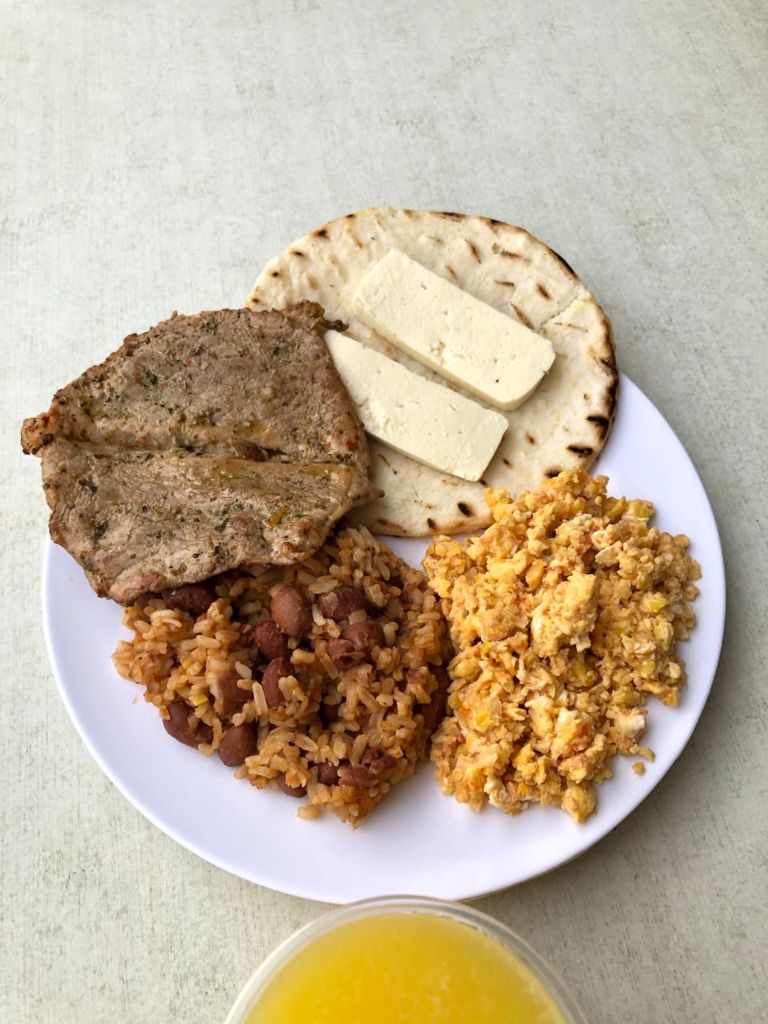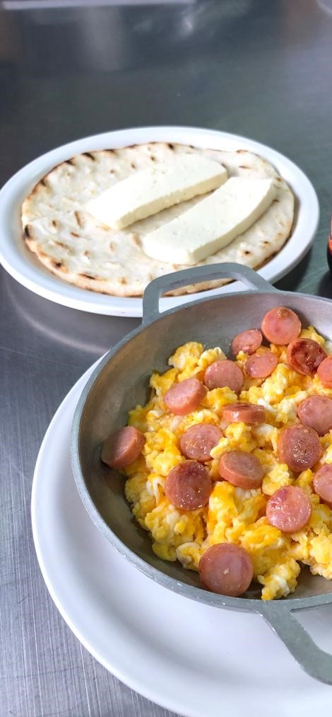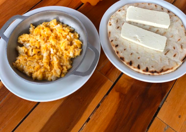 huevos con aliños, arepa, quesito y mantequilla