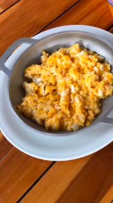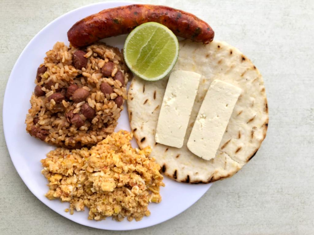 Arepa con quesito, huevos revueltos, calentado con frijoles y chorizo.