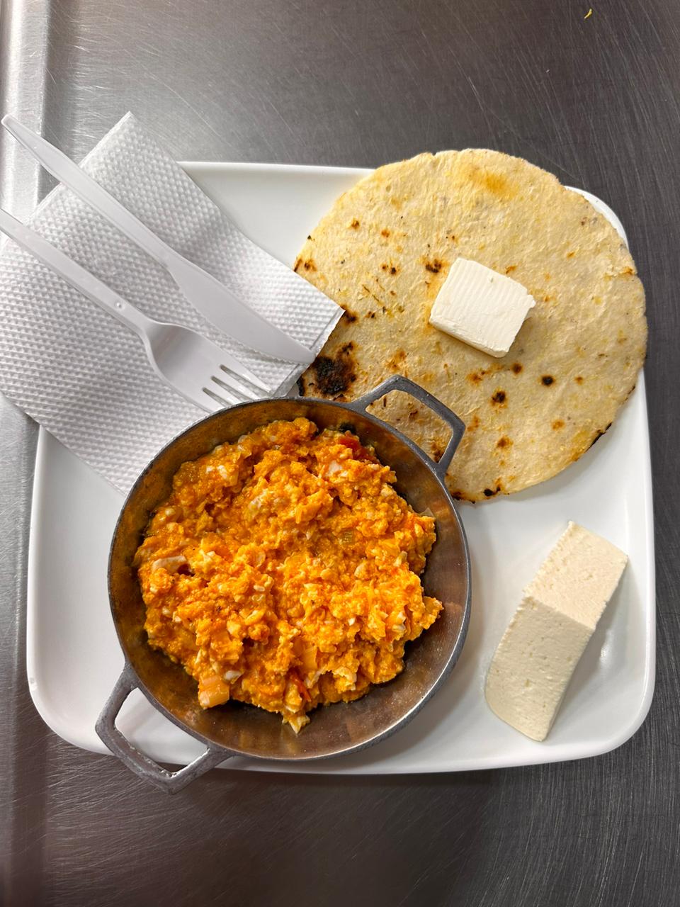 2 Huevos revueltos tradicional con arepa de maíz blanco y quesito.