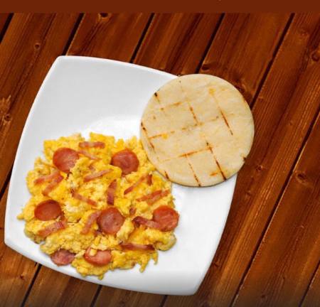 2 Huevos revueltos a elección jamón o con salchicha ranchera acompañado con arepa de maíz blanco y quesito