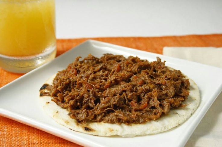 Arepa acompañada de carne de res desmechada con hogado