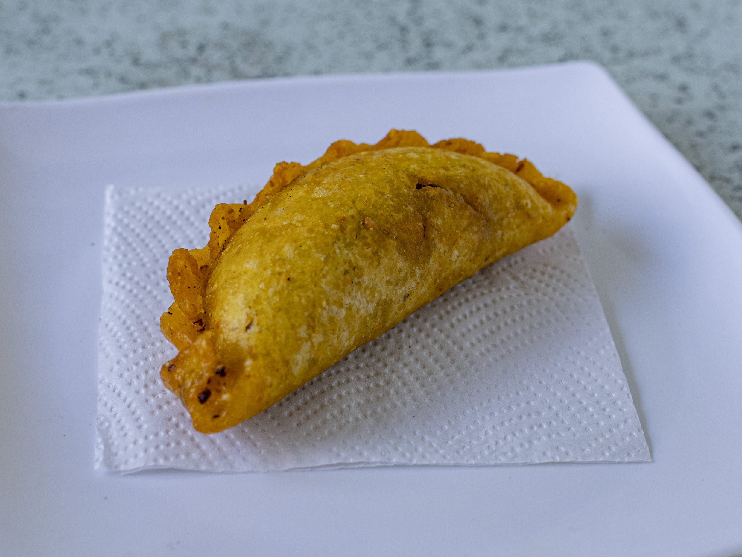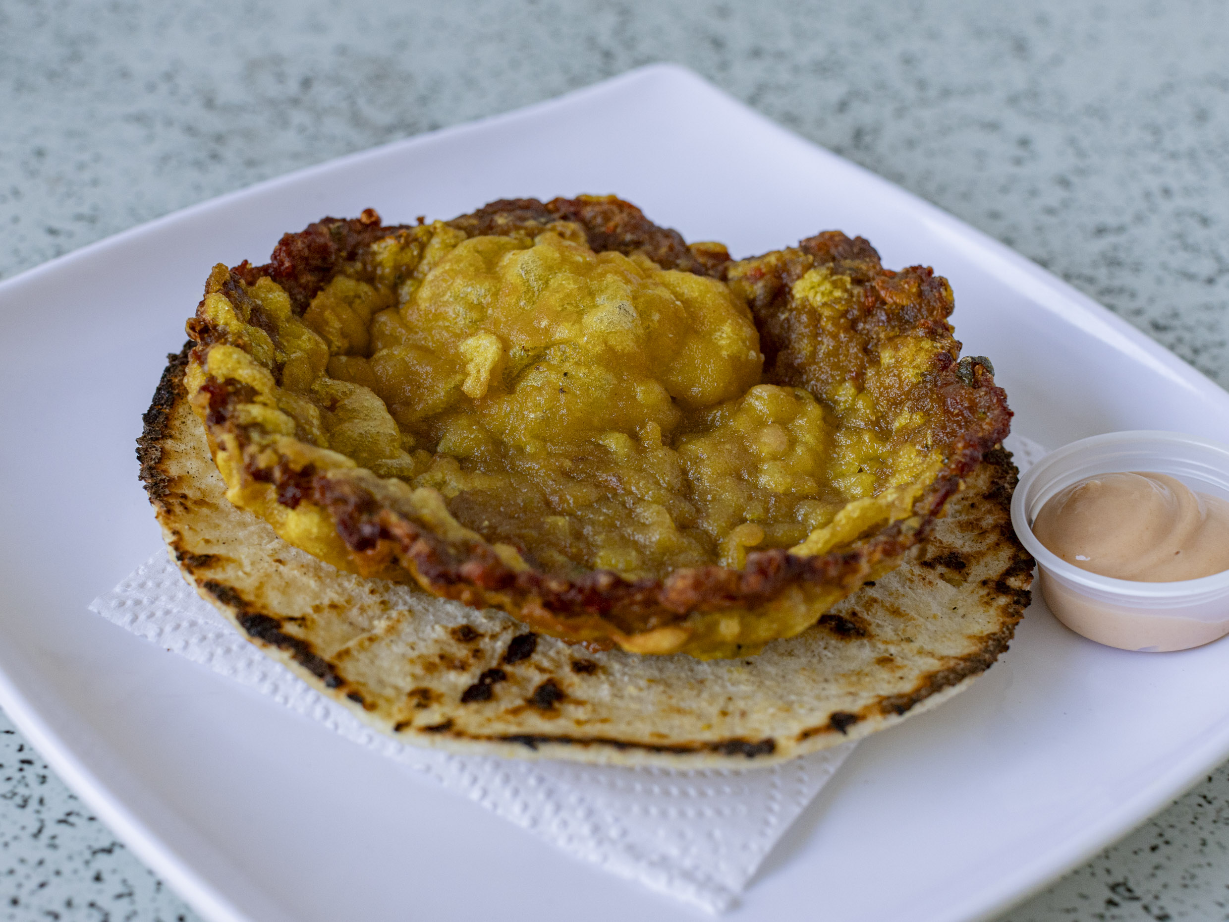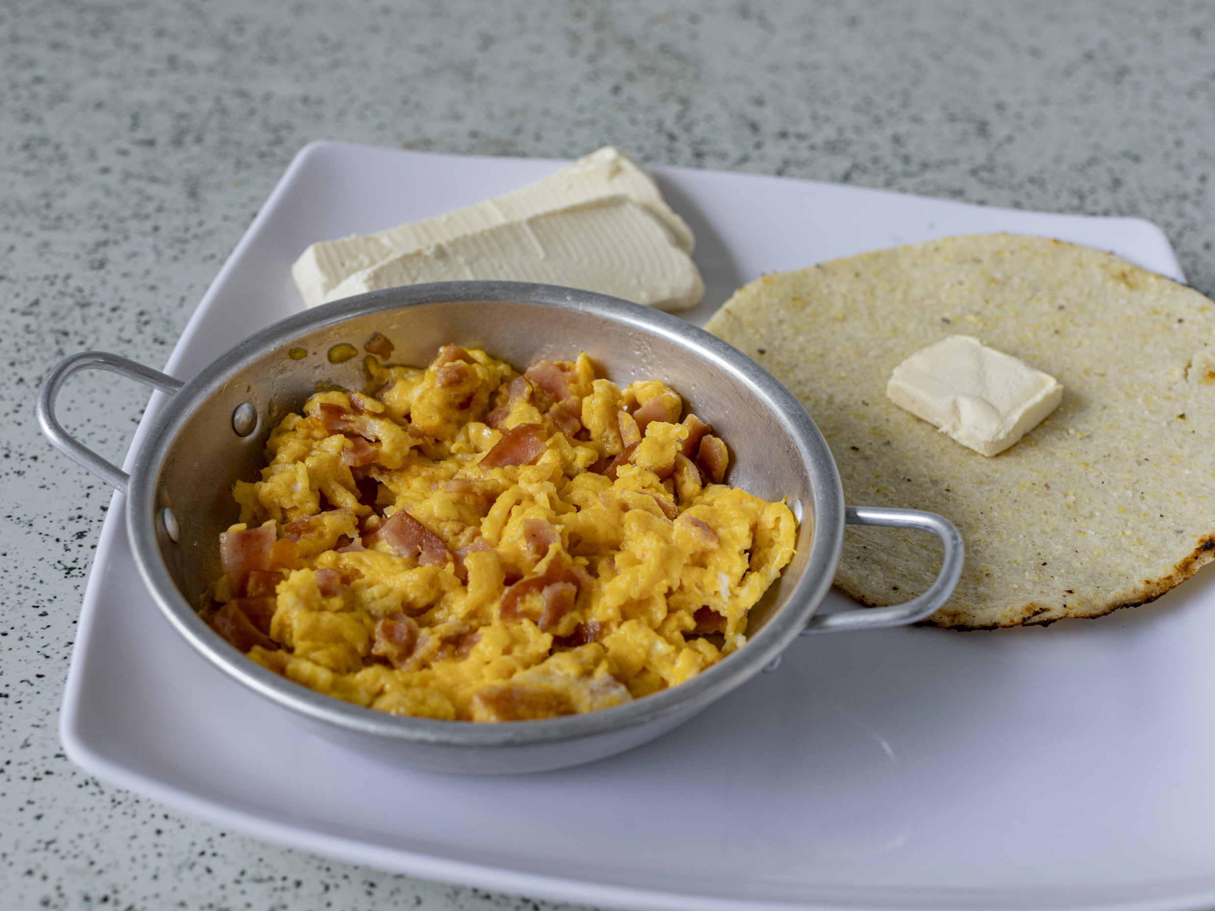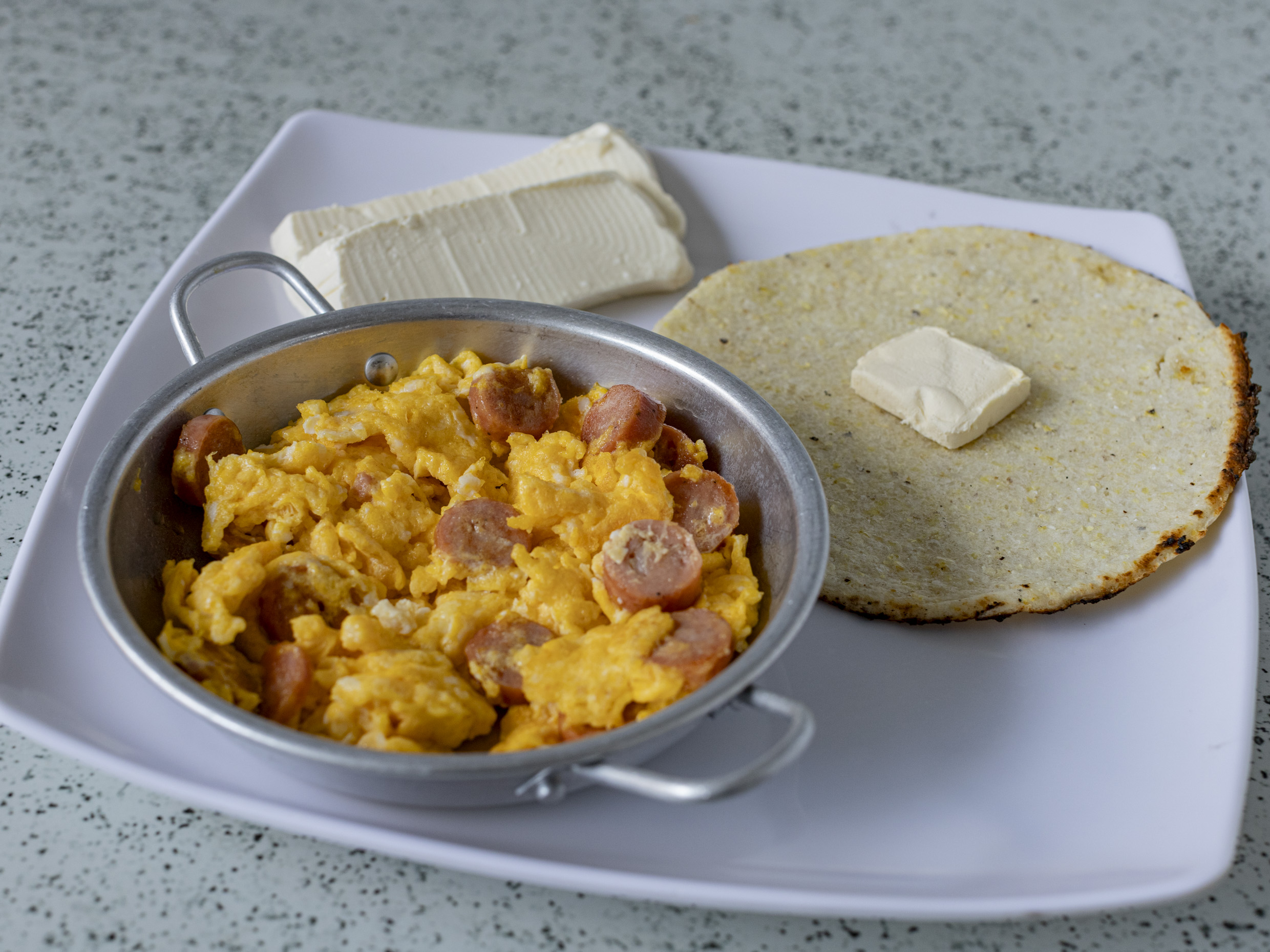 Arepa blanca con quesito, huevitos revueltos con salchicha tipo ranchera
