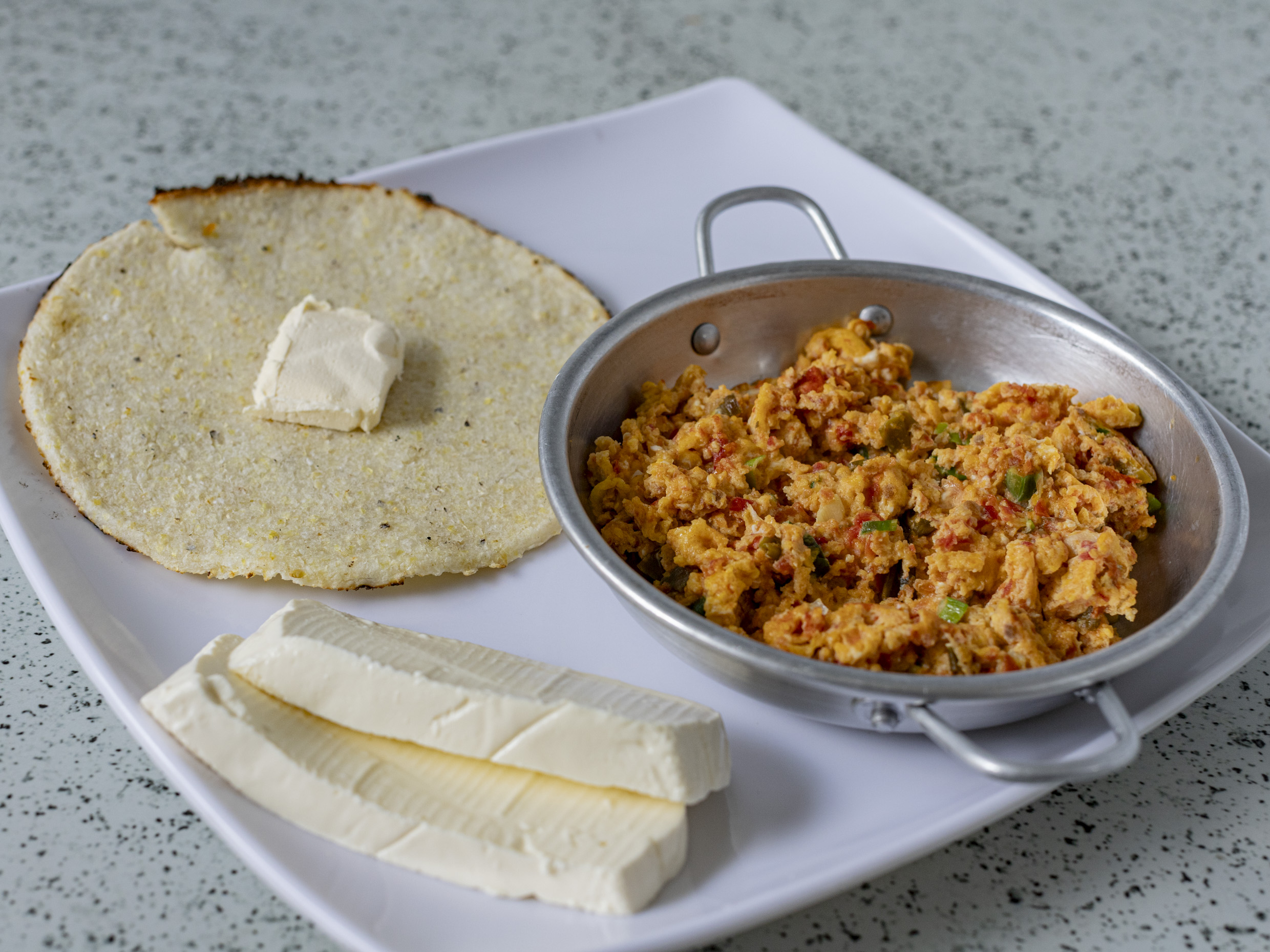 Arepa blanca con quesito quesito, y huevitos revueltos con hogao