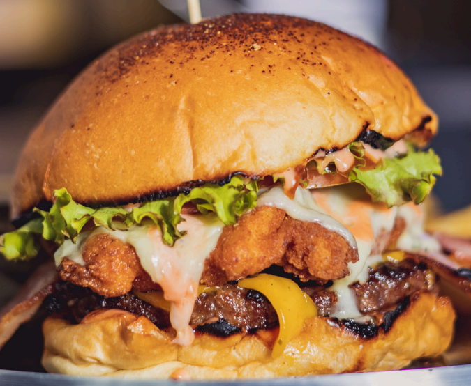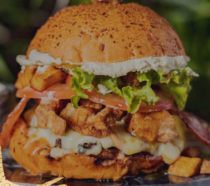 Pan artesanal, 150 g solomo, filete de pechuga, tocineta, queso mozzarella, queso cheddar, lechuga y tomate.