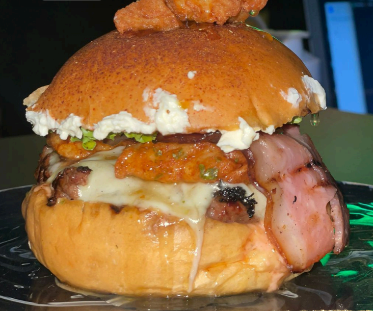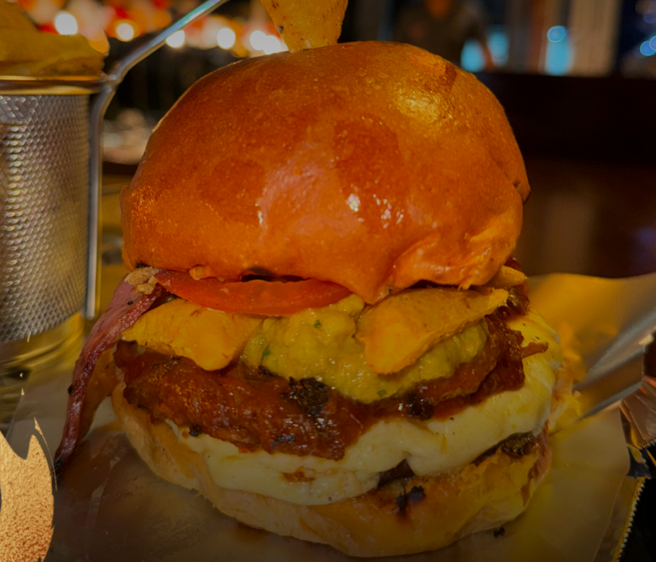 Pan artesanal, 150 g punta de anca, 80gr de ropa vieja, guacamole, tostacos, mozzarella de búfala, tocineta, lechuga y tomate.