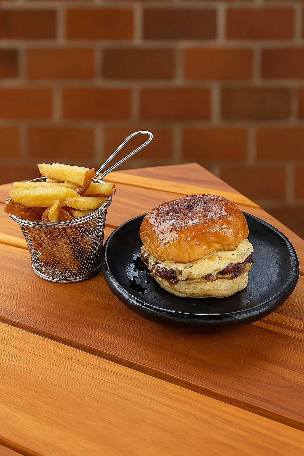 Pan brioche, jugosa carne de res artesanal, queso mozarella, salsas a eleccion, acompañada de papas a la francesas.