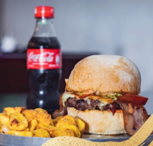 Pan artesanal, 130gr solomo, tocineta, queso mozzarella, lechuga, tomate, porción de papas en casco y Coca Cola 250 ml.