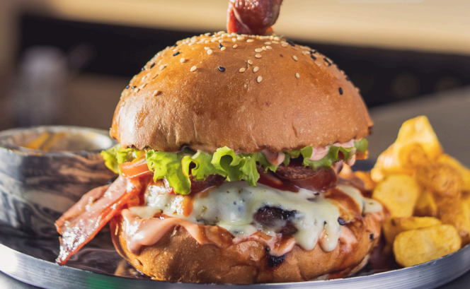 Pan brioche, jugosa carne de res artesanal, tocineta, queso mozarella, salsas a eleccion, acompañada de papas a la francesas.