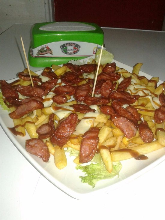 Papas a la francesa, chorizo de cerdo, lechuga, queso, ripido y salsas de la casa.