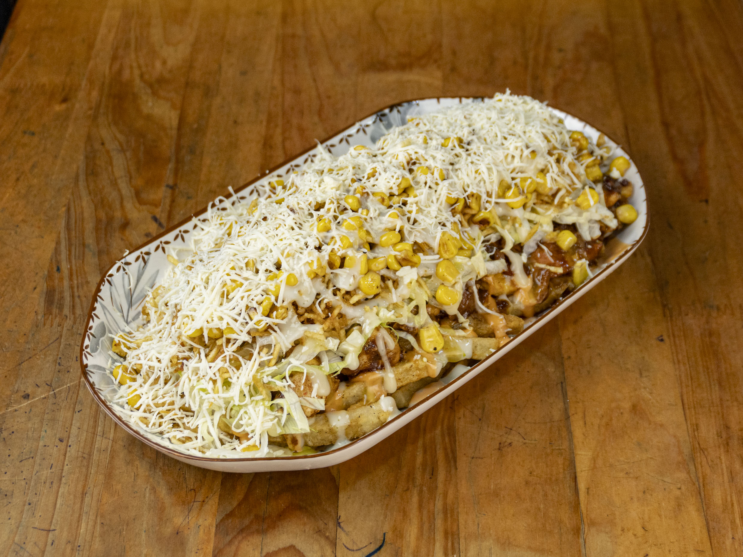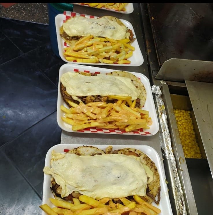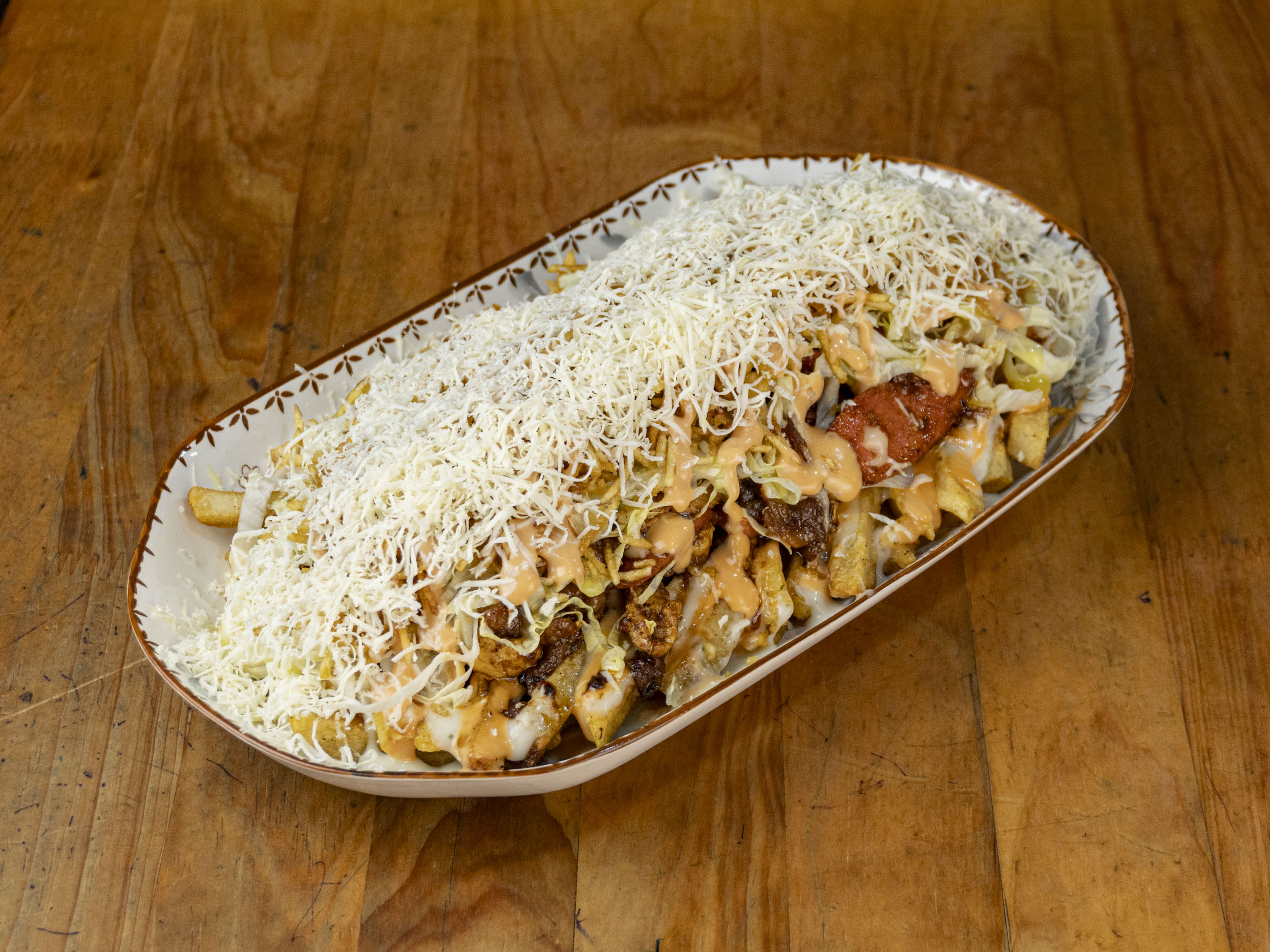 Carne desmechada, pollo, hogao, tocineta, queso, papas a la francesa y salsas de la casa.
