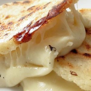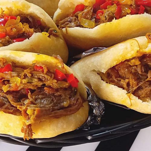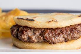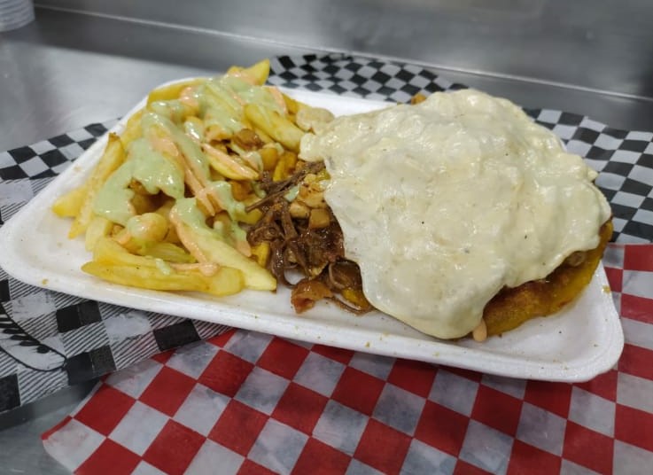 Arepa con carne de hamburguesa, papa a la francesa, tocineta, queso y salsas de la casa.
