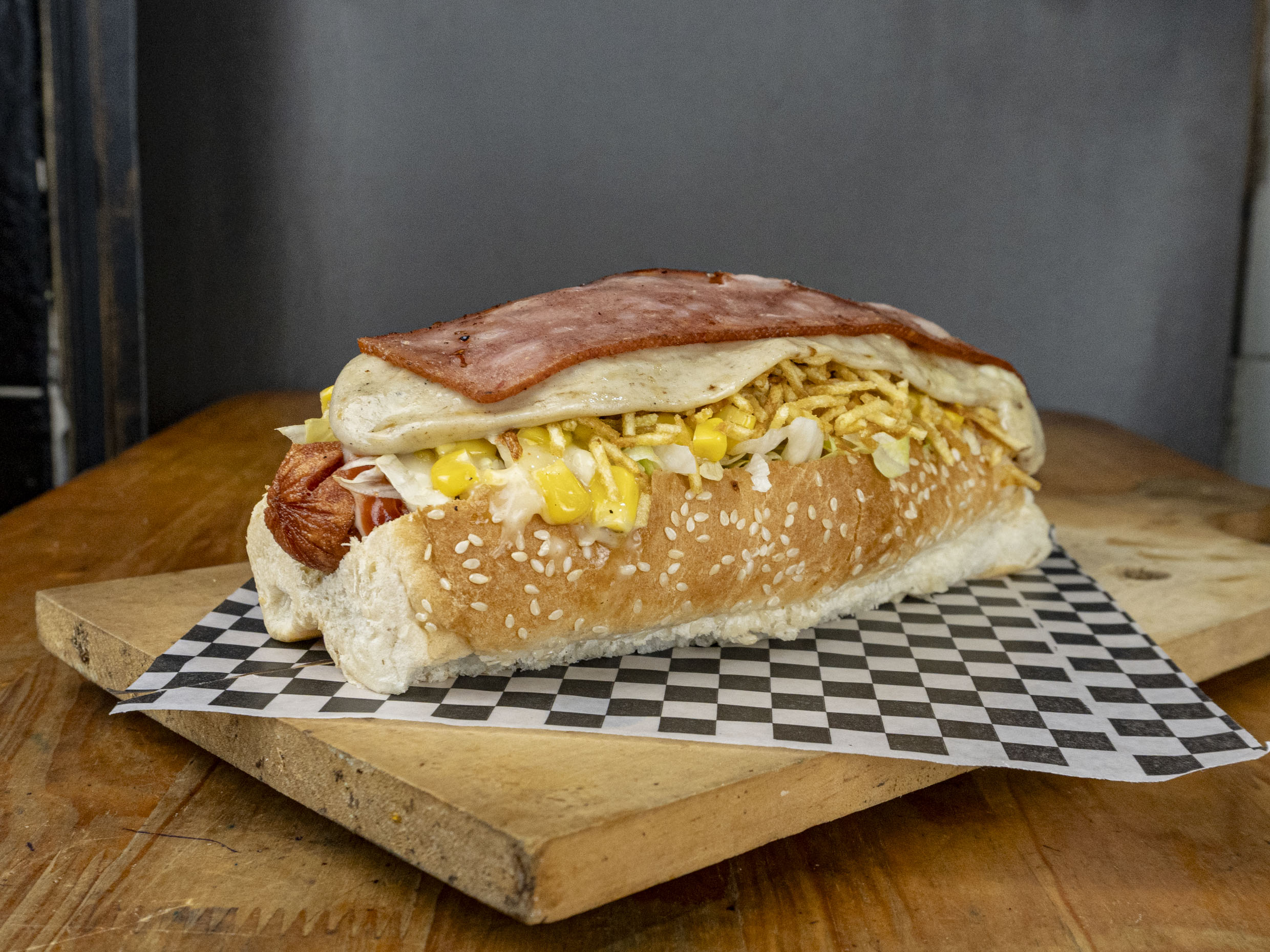 Pan, salchicha americana, ensalada de lechuga, maicitos, ripido, queso, tocineta y salsas de la casa.