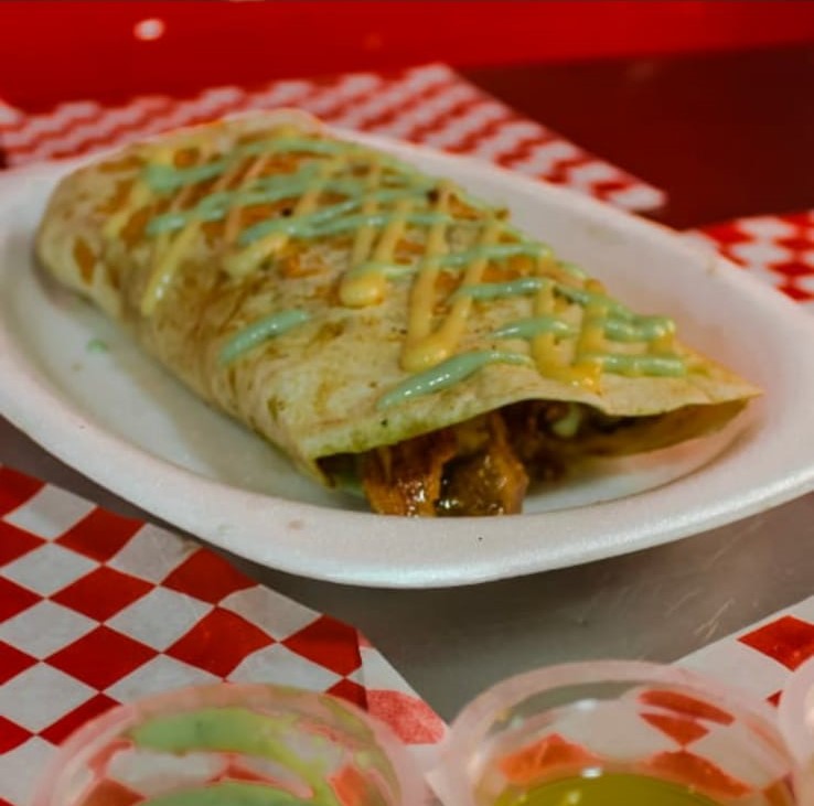 Tortilla de harina, lechuga, carne molida, pollo, tocineta, maíz, tártara, guacamole y salsas de la casa.