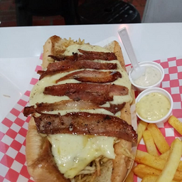 Papas a la francesa, salchicha, pollo, tocineta, lechuga, queso, ripido y salsas de la casa.