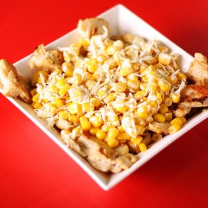 Maíz, pollo, queso, tocineta y salsas de la casa.