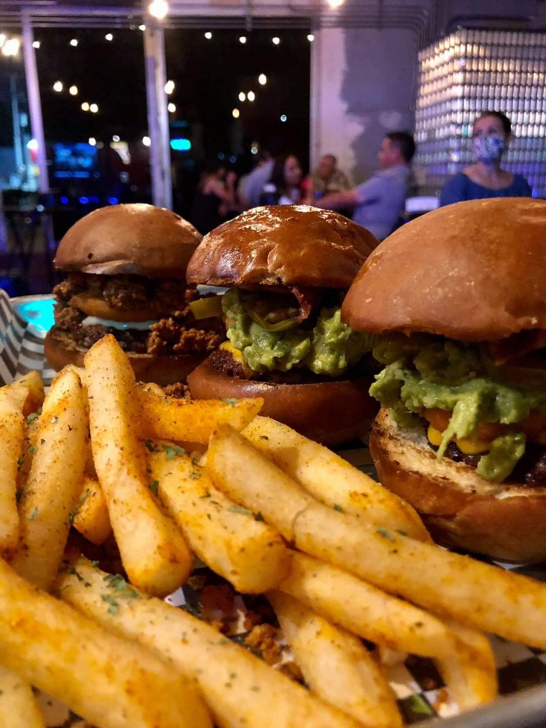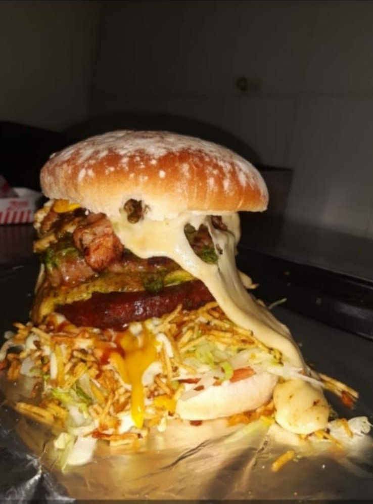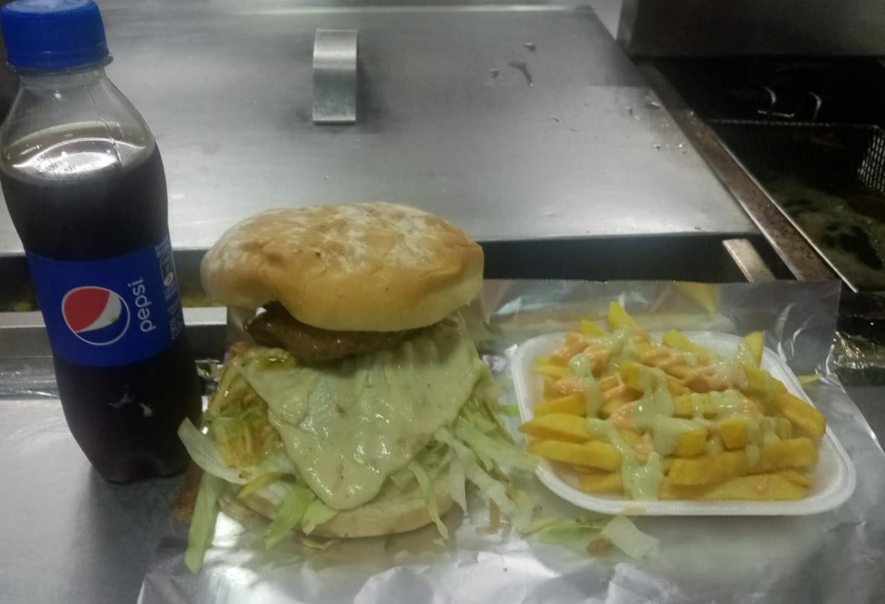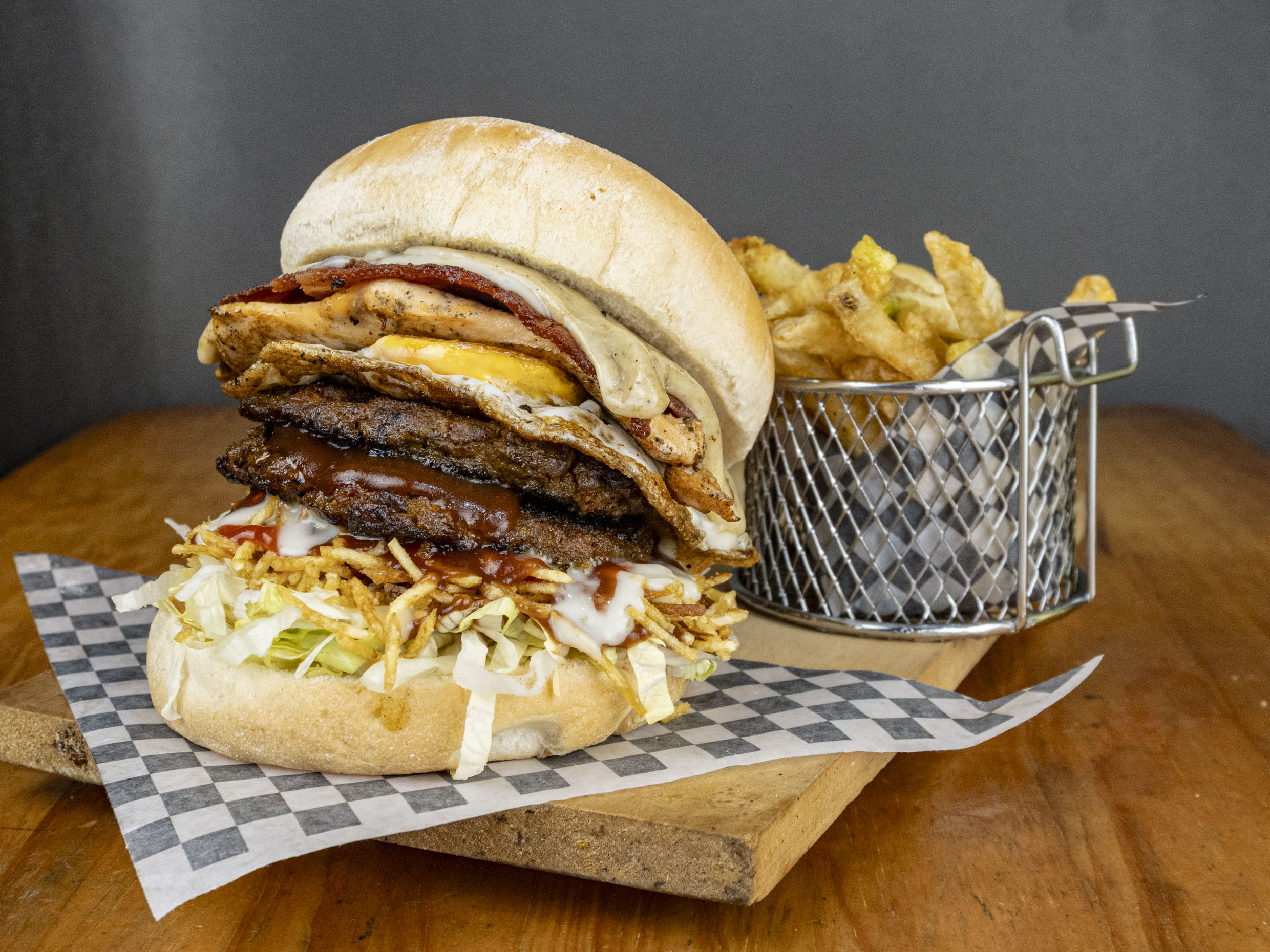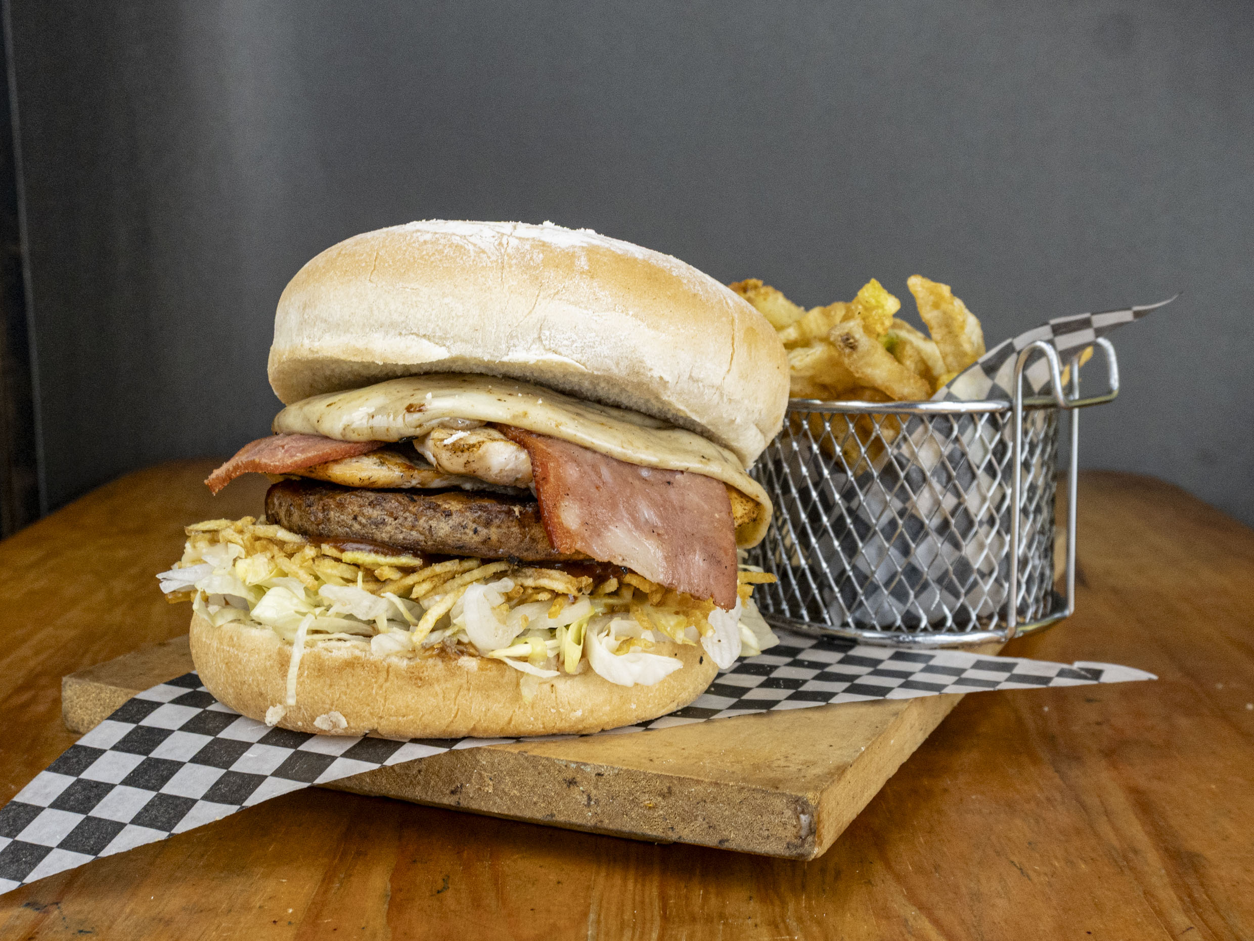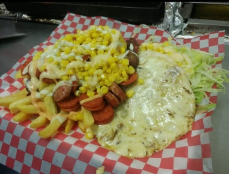 Doble carne de res, filete de pollo, huevo frito, ensalada, ripido, papas a la francesa, queso, tocineta y salsas de la casa.