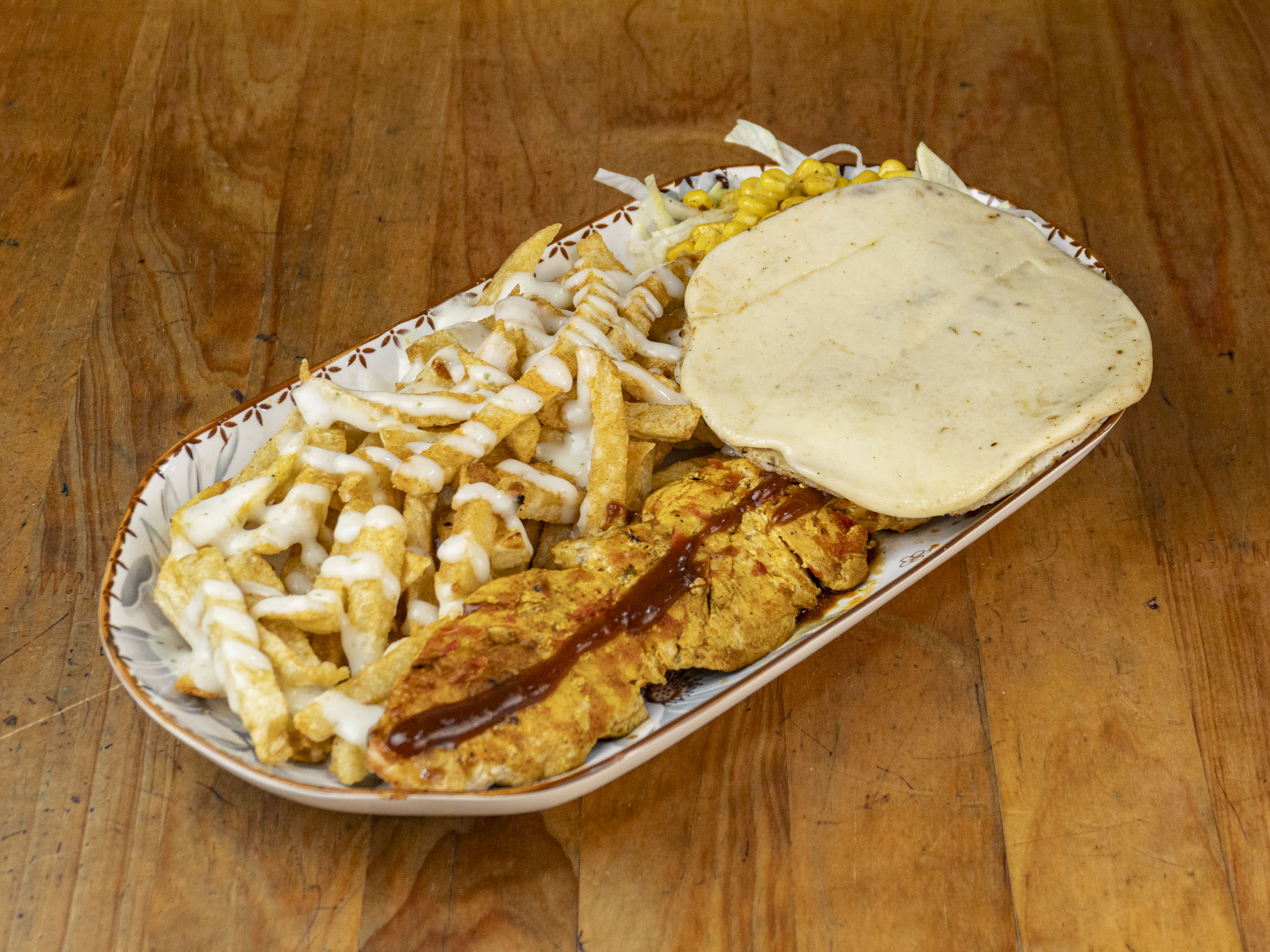 Papas a la francesa, chorizo ranchero, pollo, cerdo, arepa con queso, ensalada maíz tierno y salsas de la casa.