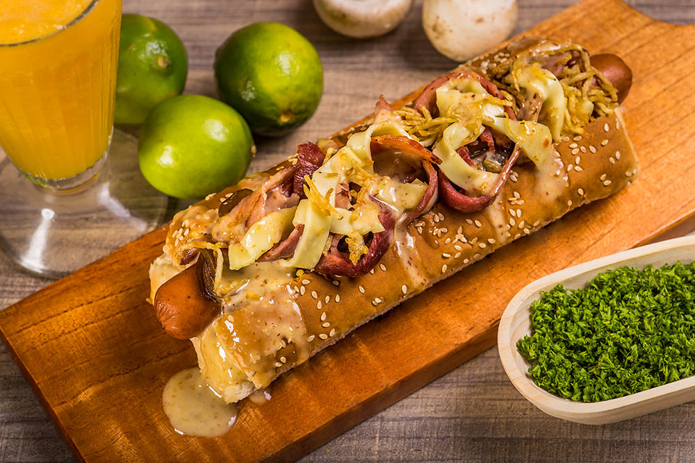 Pan, salchicha, ensalada, ripido, queso, tocineta, pollo y salsas de la casa.