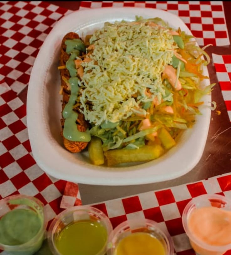Papas a la francesa, salchicha, pollo, lechuga, queso, ripido y salsas de la casa.