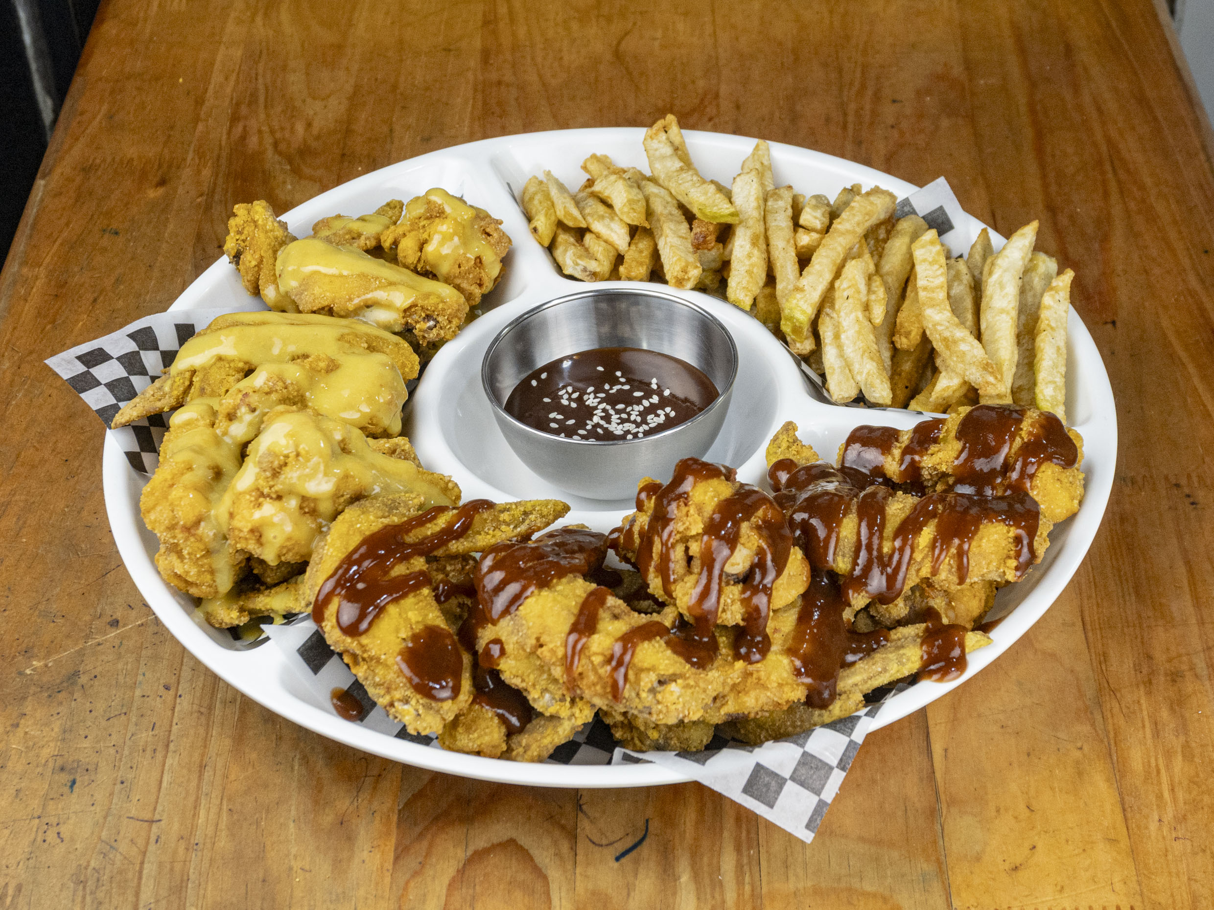 Ensalada, ripido, queso, tocineta, papas a la francesa, carne de res y filete de pollo y salsas de la casa.