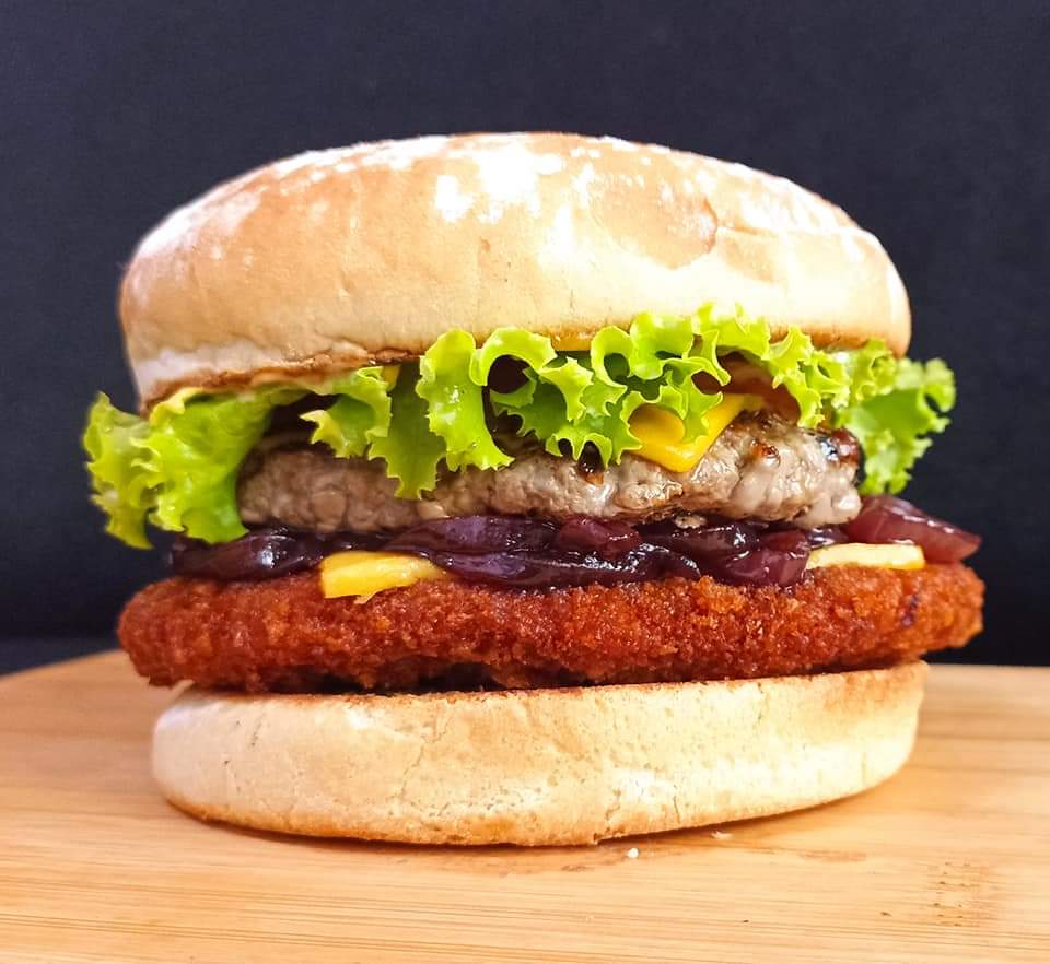 Carne de Hamburguesa con Filete de Pollo, Queso tocineta, lechuga, ripio de papas, Ensalada de lechuga y máximo 4 salsas, roja, rosada, mostaza, BBQ, Showy, maíz. Acompañado 80grs de papas