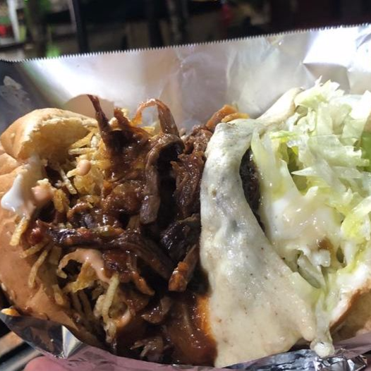 Carne de res desmechada con carne de hamburguesa pan artesanal ensalada ripio queso papas a la francesa y salsas de la casa