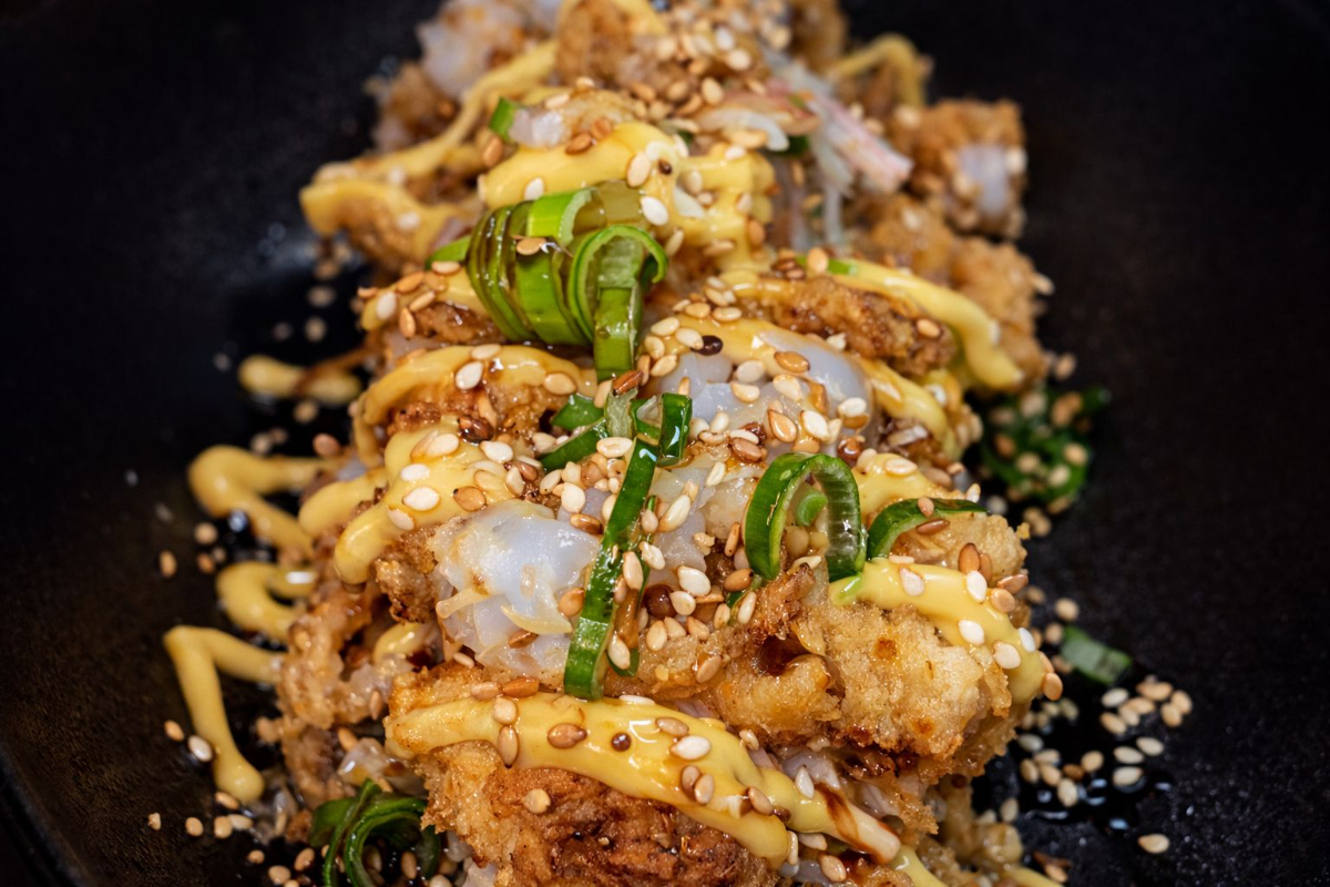 8 und de camarones apanados, puesto en una cama de arroz, bañado en salsa nikkei.