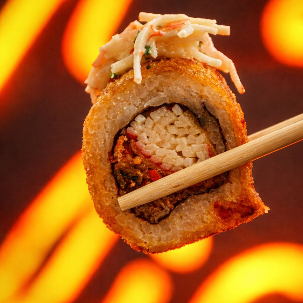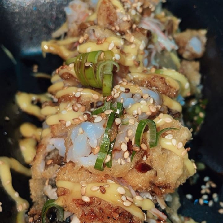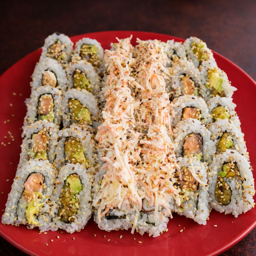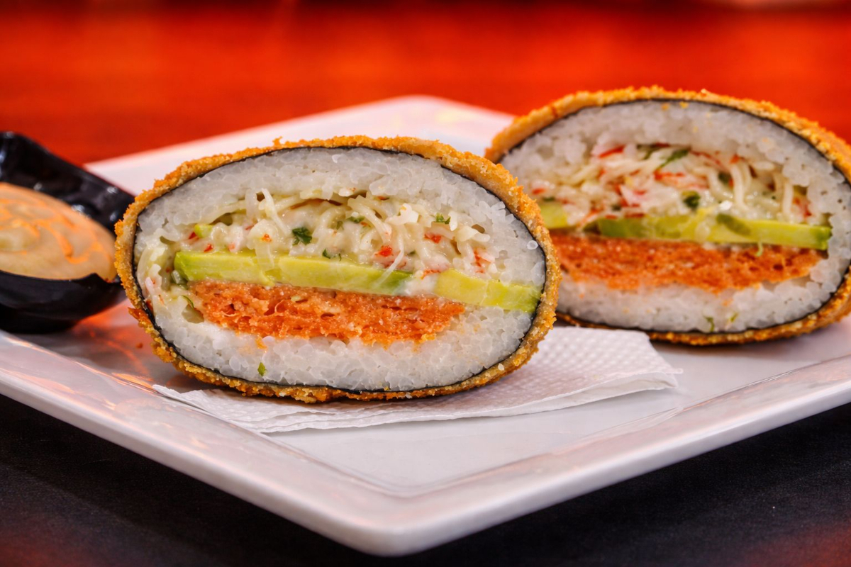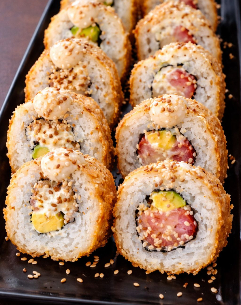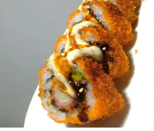 Platillo personal: espectacular rollo de 10 bocados, relleno de queso crema, aguacate y palmito de cangrejo, todo empanizado y bañado en salsa especial de la casa.