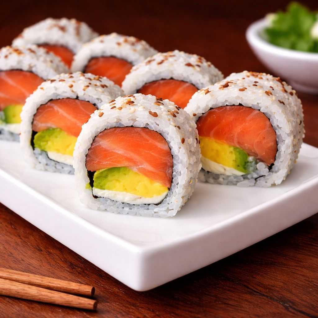 Tradicional Rollo de10 bocados, relleno de queso crema, salmon fresco y aguacate (/todo apanado)