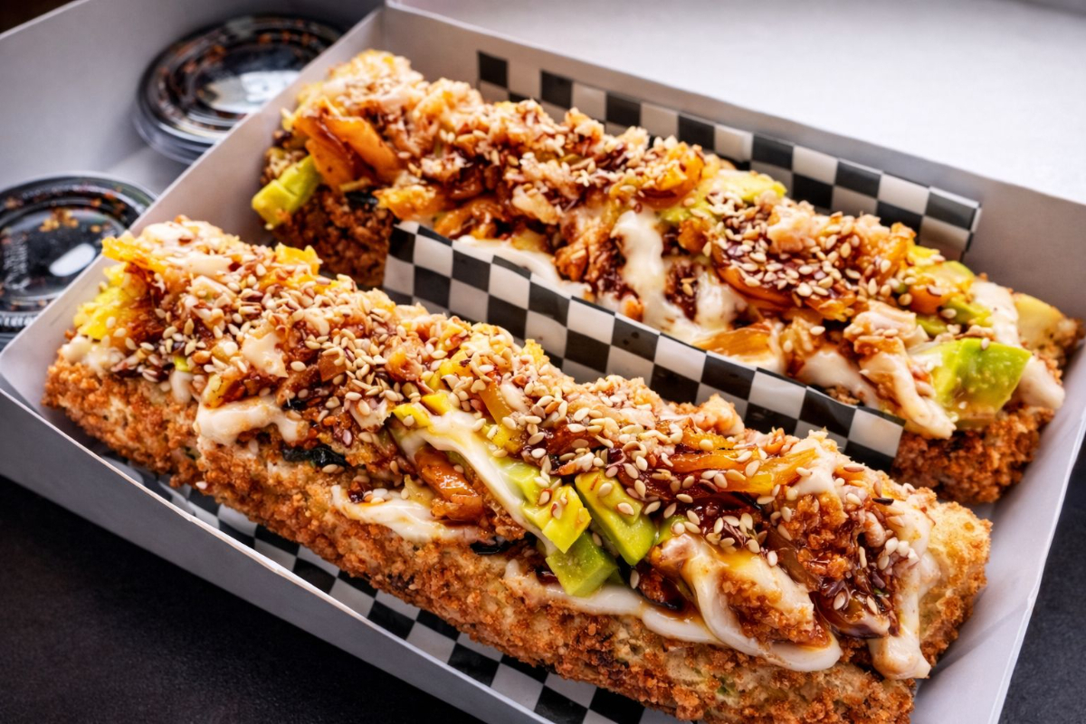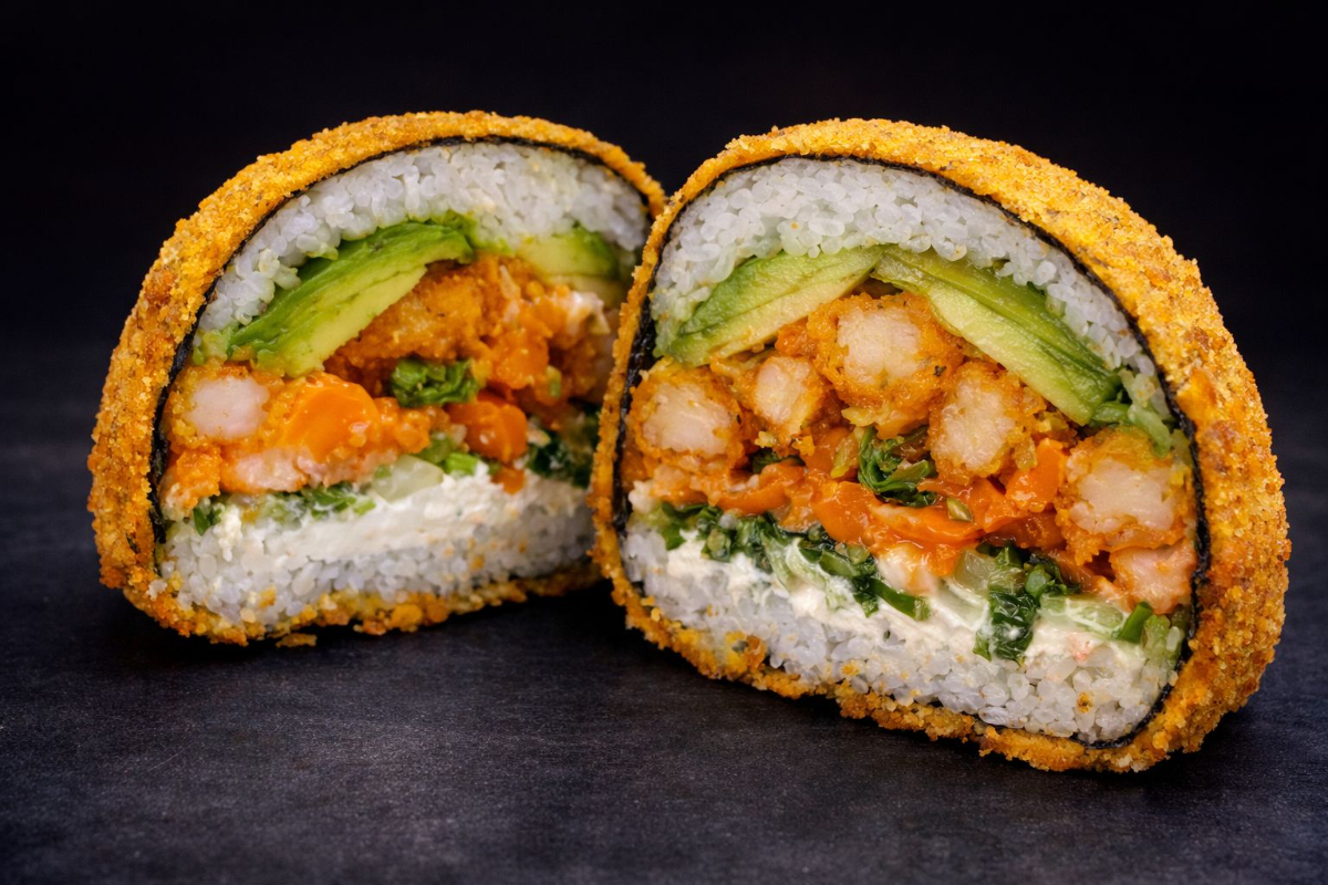 Sushi dog, arroz apanado, relleno de queso crema, vegetales apanados, aguacate y palmito crunch. Una sola pieza