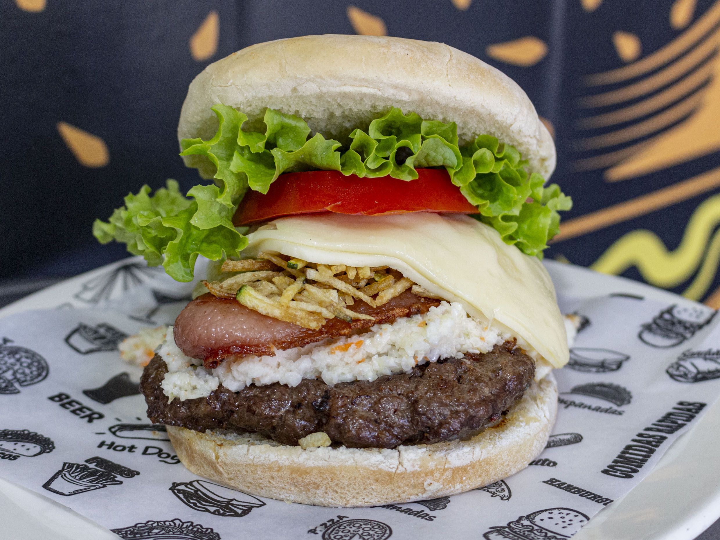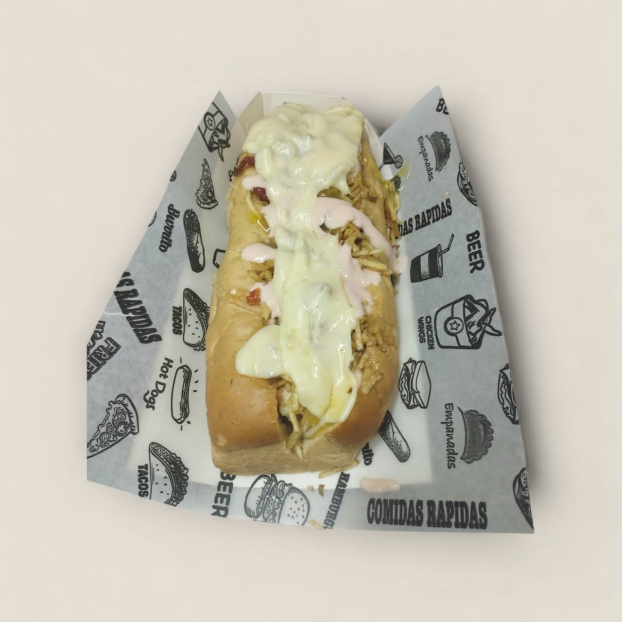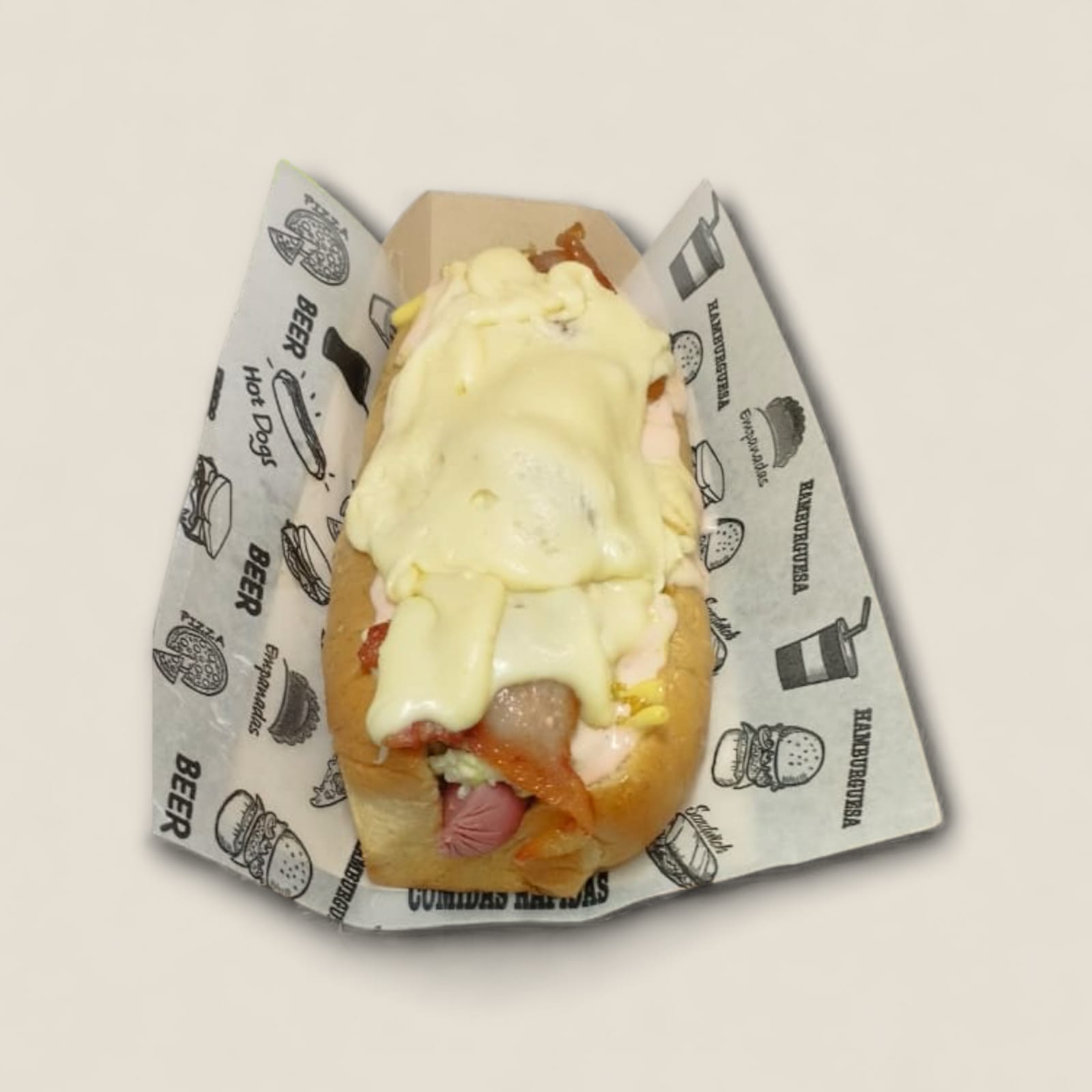 Pan artesanal, salchicha, doble queso mozarella, doble tocineta, ensalada dulce, ripio de papa y salsas al gusto.