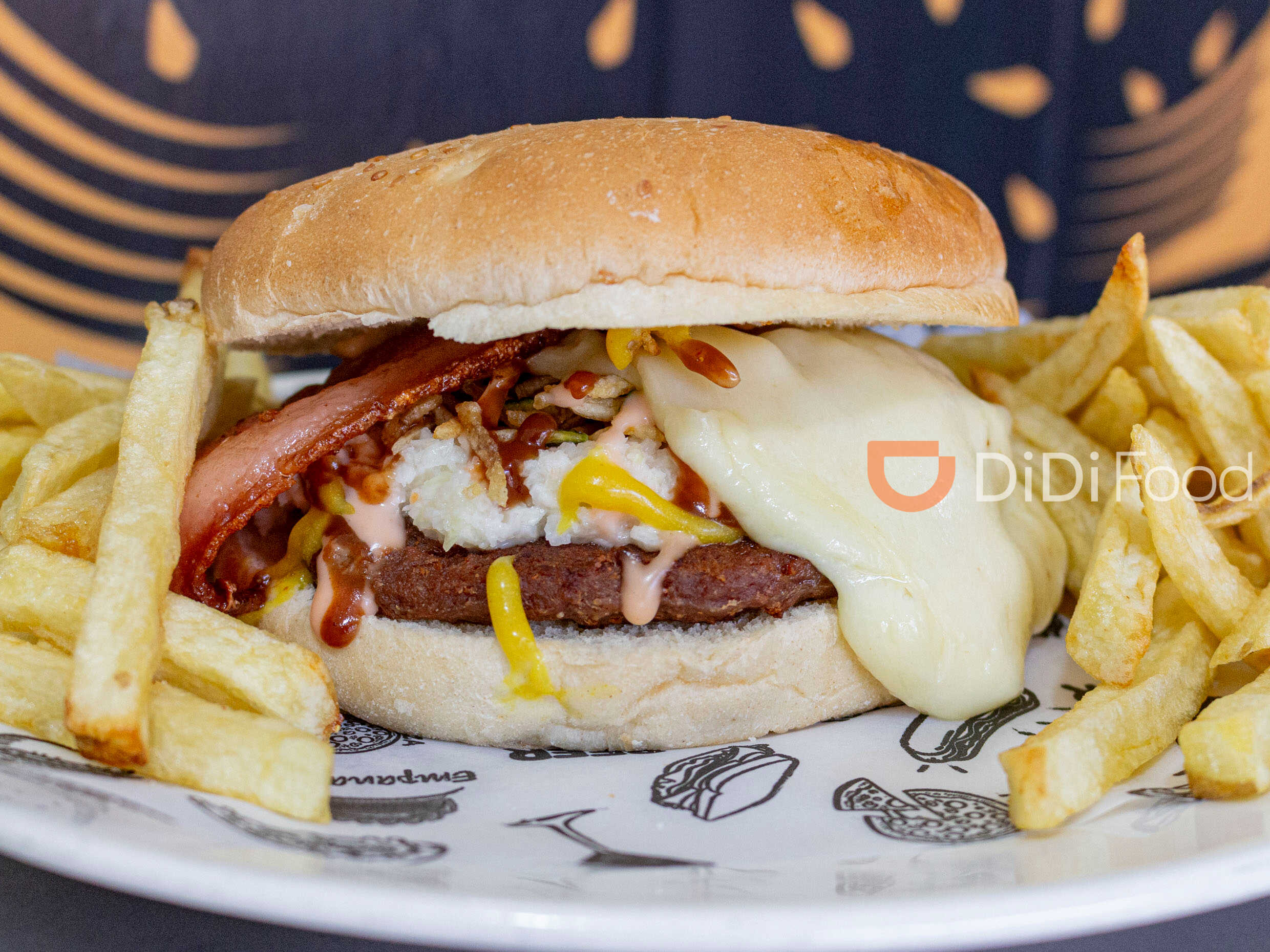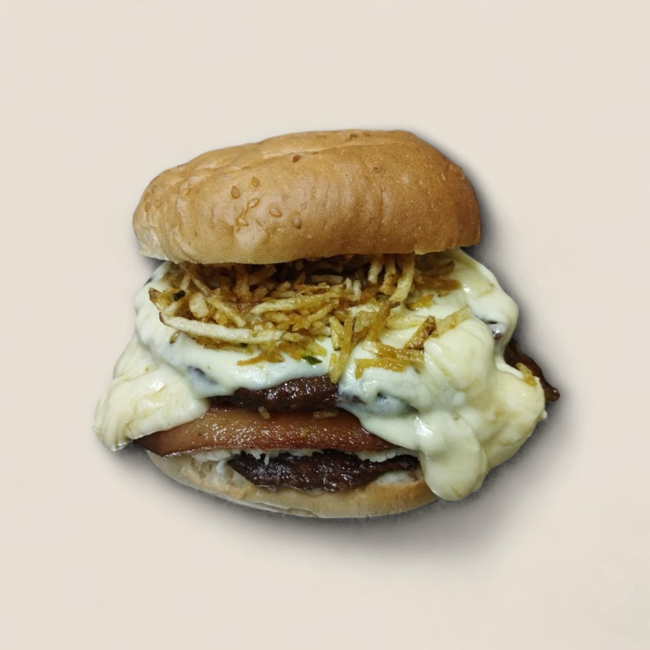 Hamburguesa triple con pan de papa artesanal, doble carne, triple queso, triple tocineta, ensalada dulce y salsas al gusto.