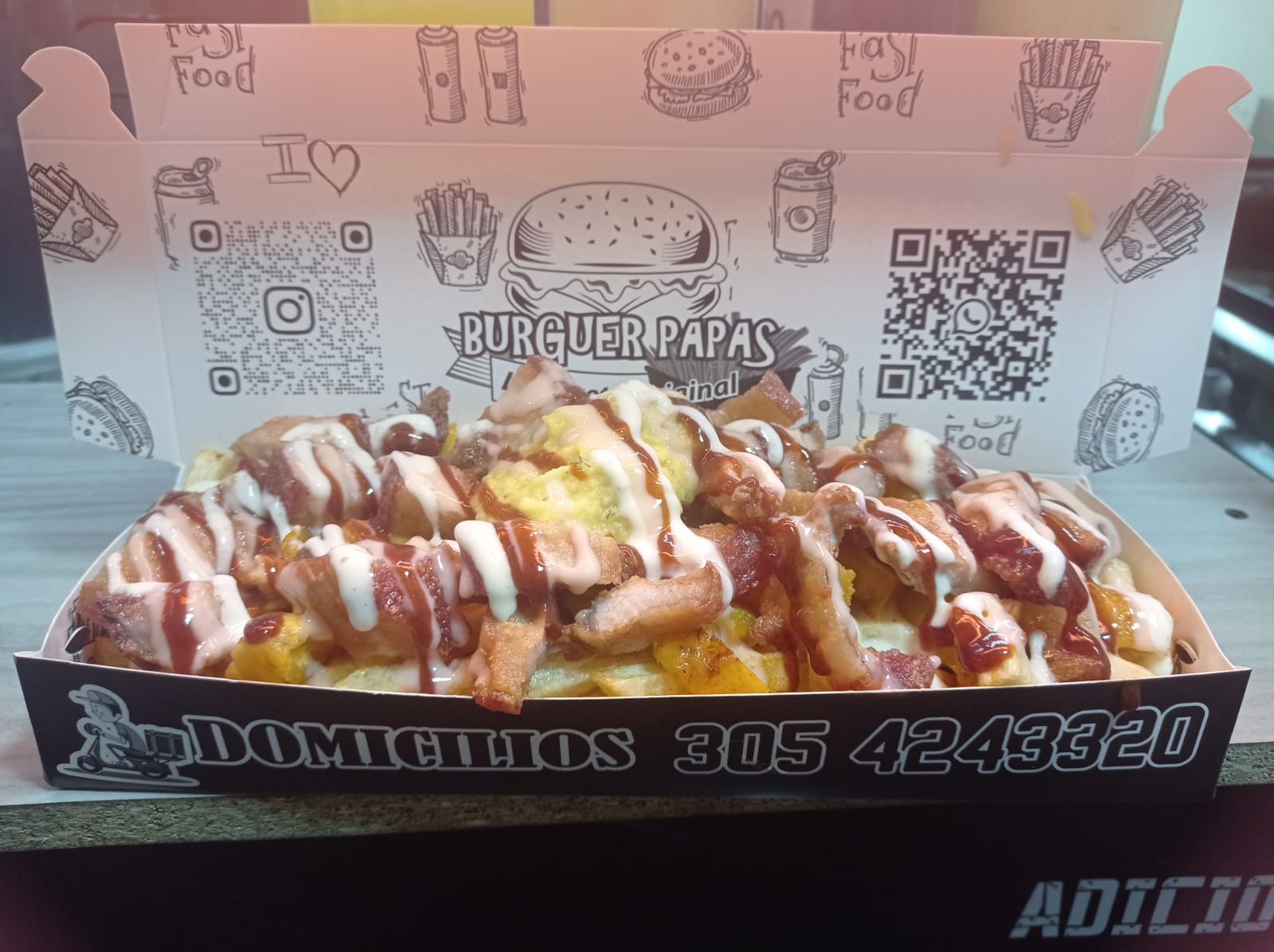 Base de papas a la francesas crujientes de 300gr, trozos de chicharrón frito, maduritos picados frito, guacamole y salsas al gusto.