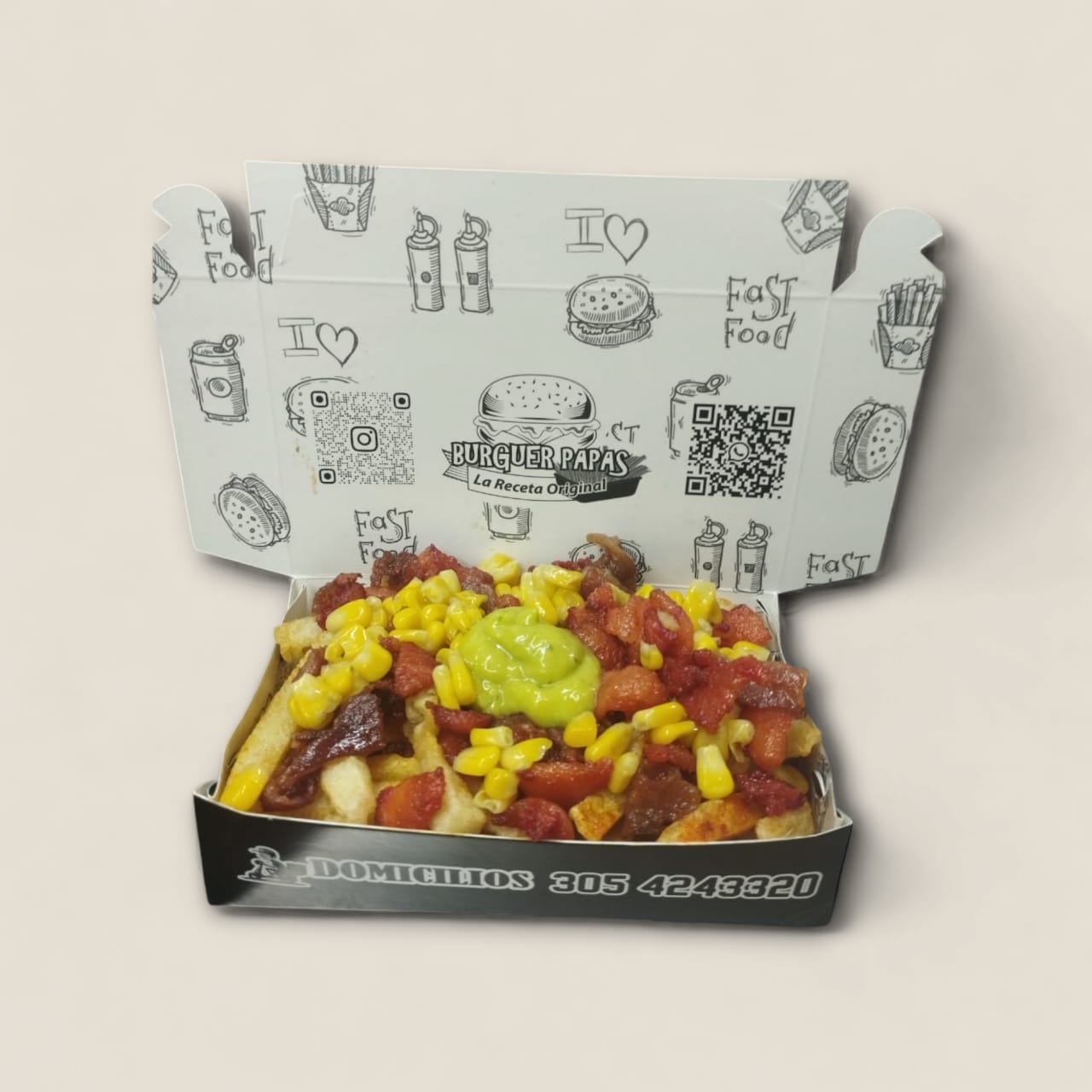 Base de papas a la francesas crujientes de 600gr, chips de tocineta, maíz tierno, guacamole y salsas al gusto.
