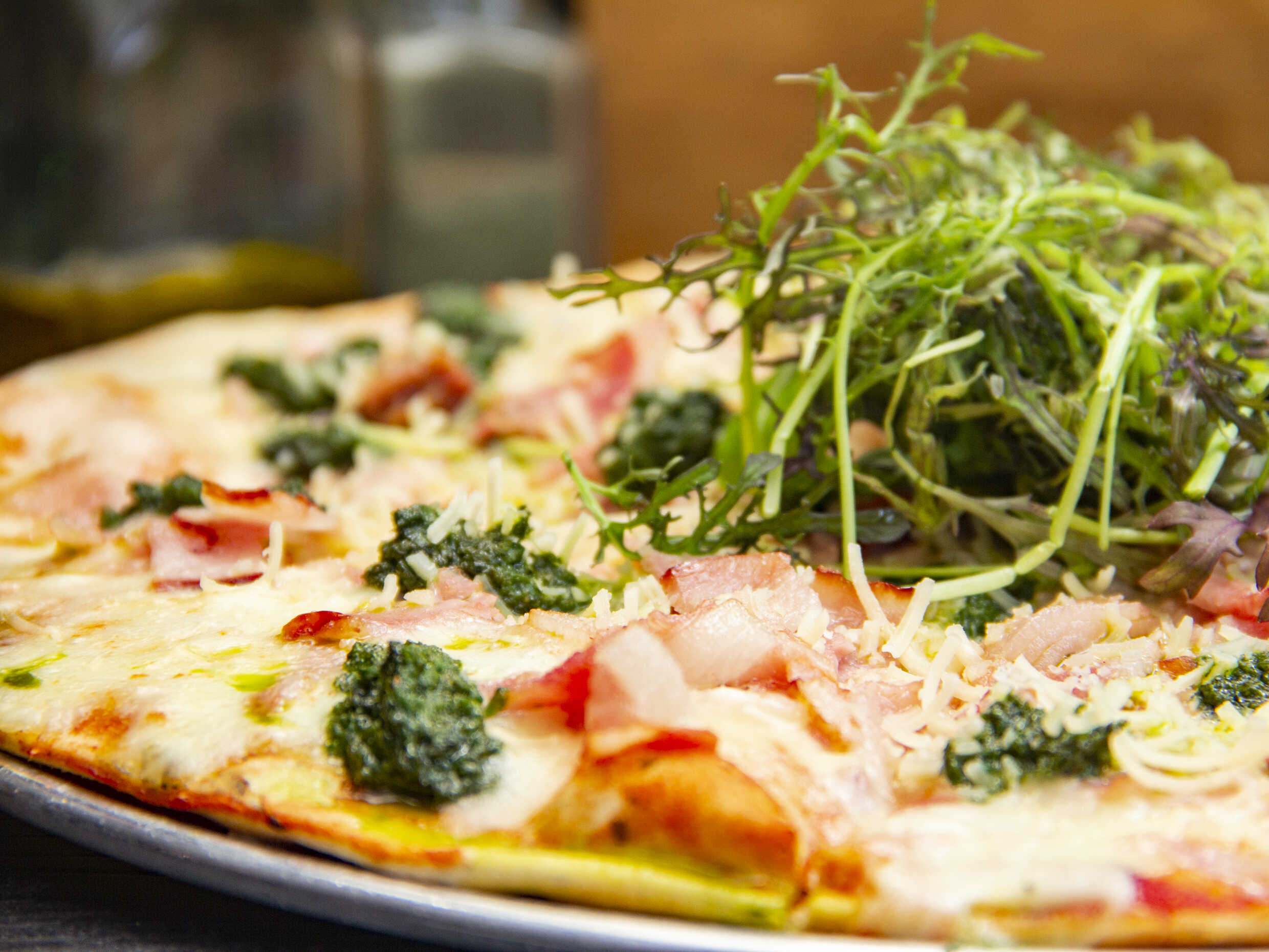 Base de napolitana, queso mozzarella, tocienta, pesto y queso parmesano.