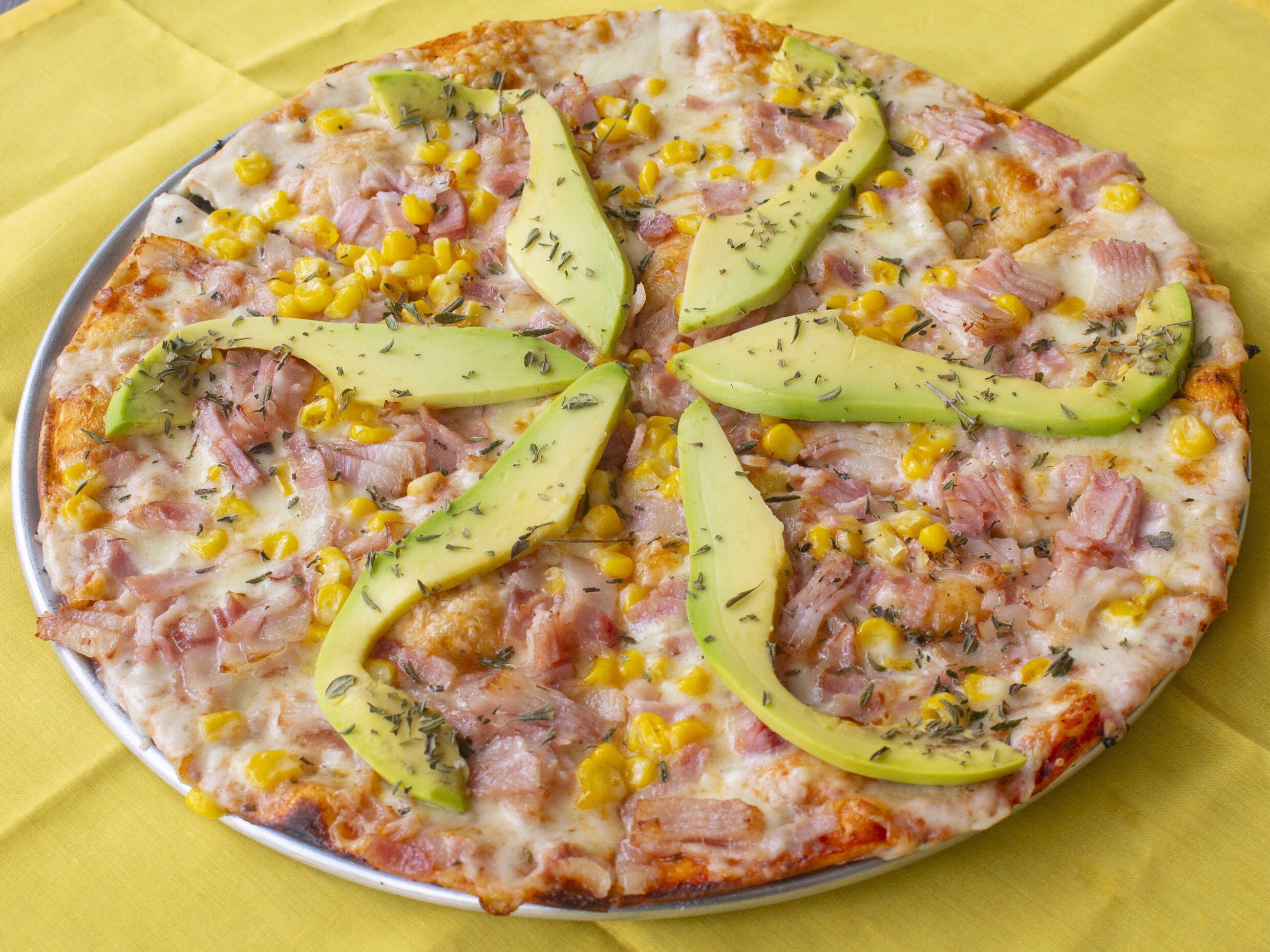 Napolitana servida con maíz tierno, tocineta, mozzarella y aguacate.