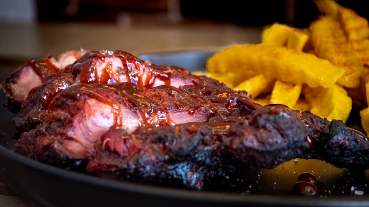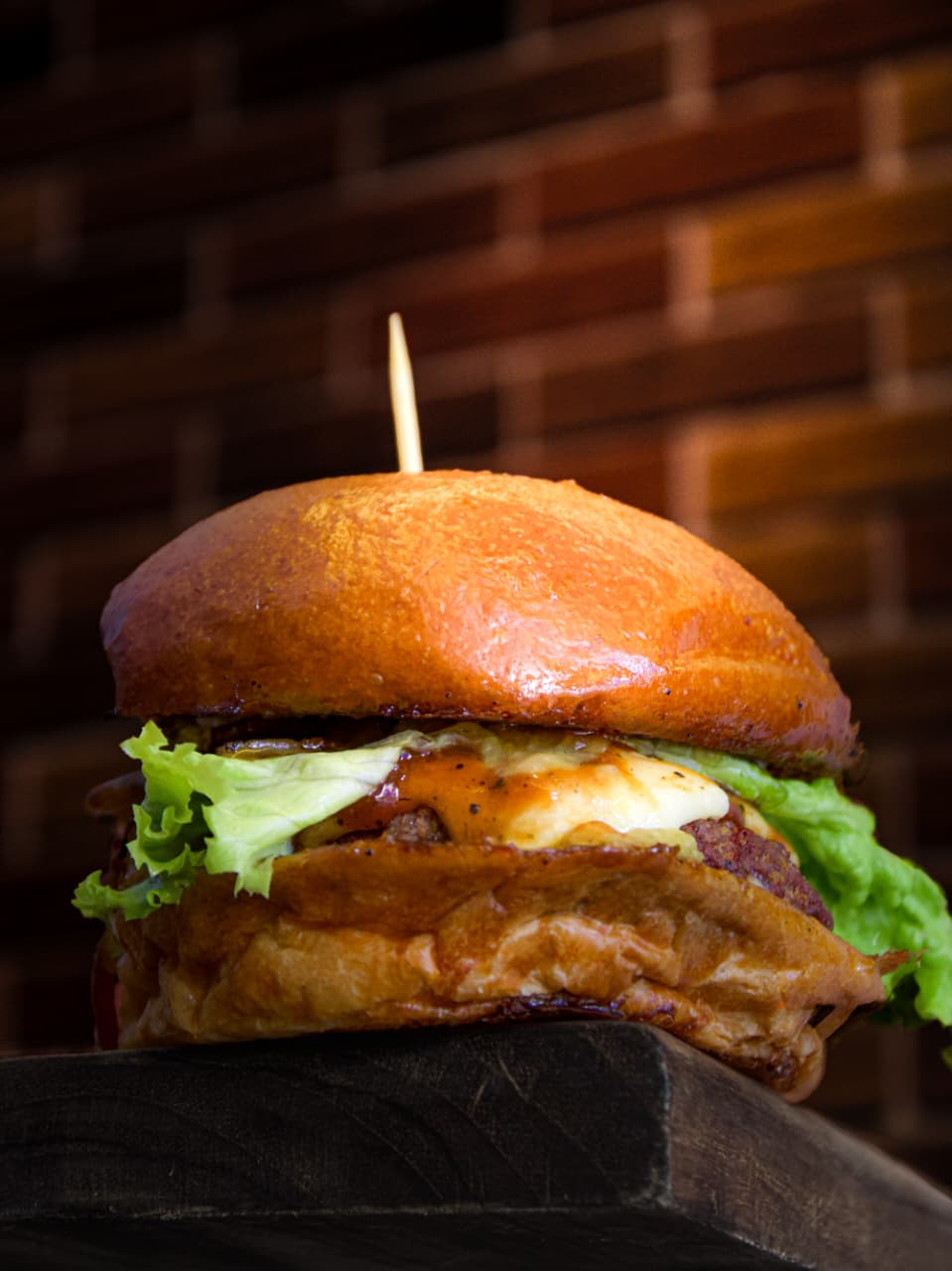 Pan dorado en salsa dulce, carne artesanal, queso, lechuga, tomate, cebolla caramelizada, queso crema y salsa de la casa, con papas a la francesa.