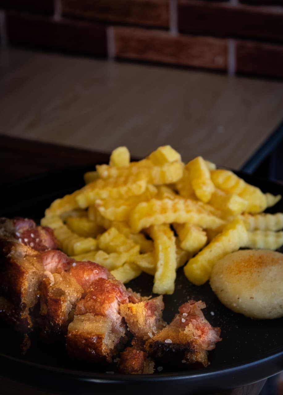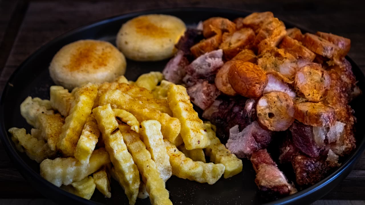 Chicharrón acompañado de papas, arepas y salsa a elección.