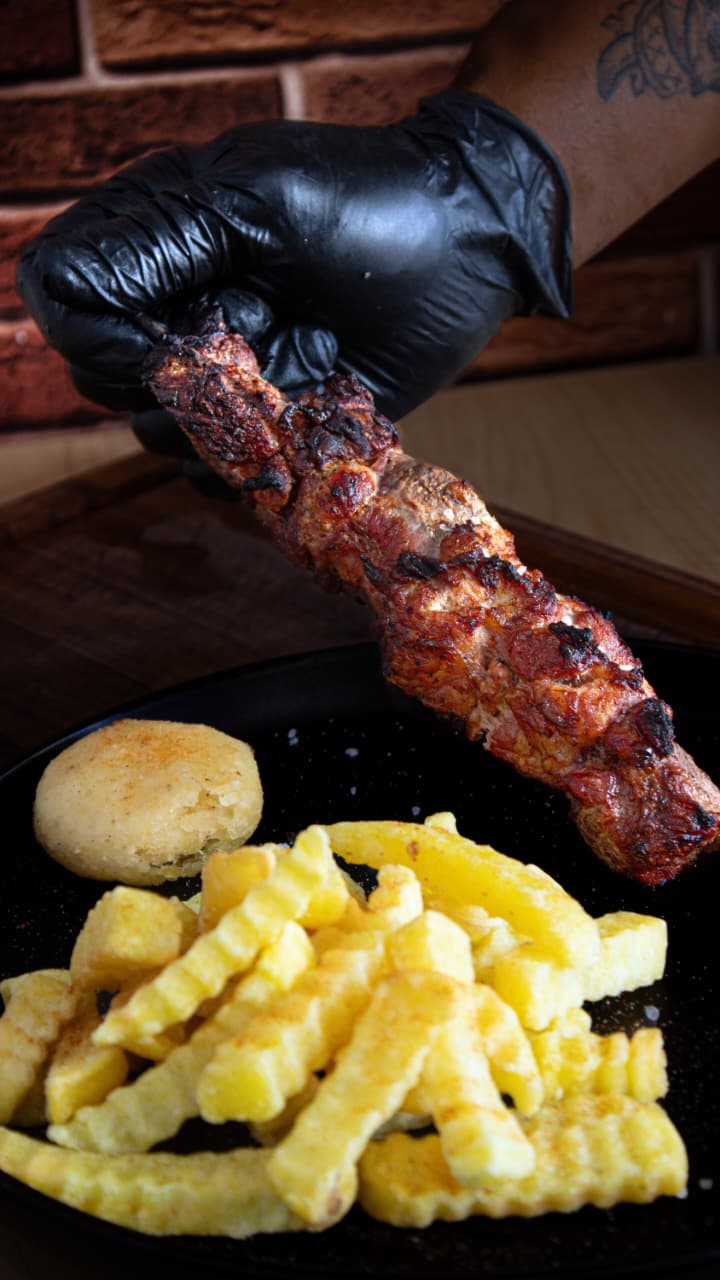 Chuzo de cerdo acompañado de papas, arepas y salsa a elección.