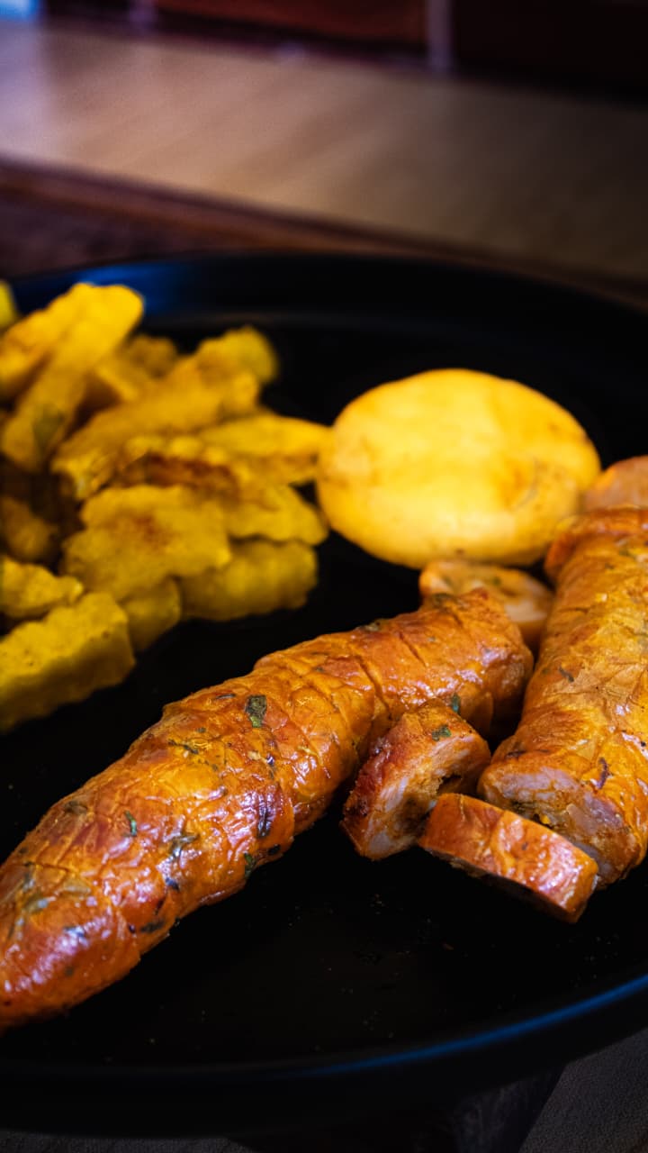 Chorizo artesanal acompañado de papas y salsa a elección.