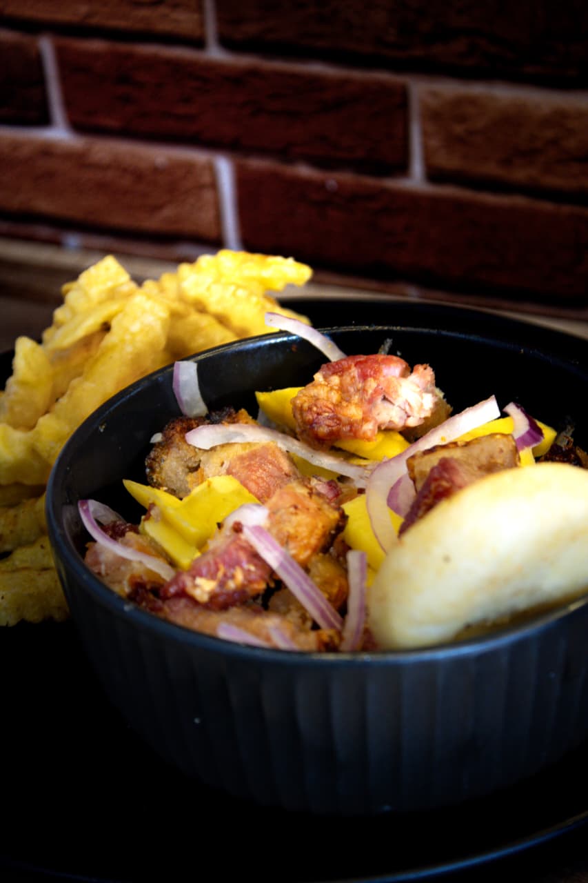 Ceviche de chicharrón acompañado de papas, arepas y salsa a elección.