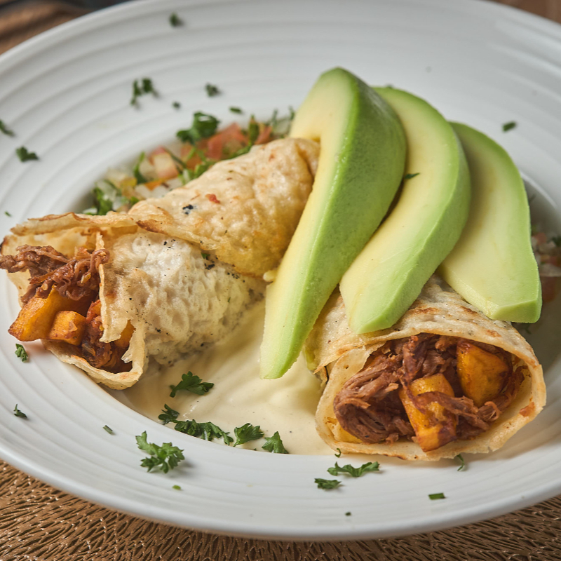 Deliciosa carne desmechada sazonada, envuelta en esferas de plátano maduro, acompañado de una cama de guacamole cremoso, queso crema y tomate confitado.